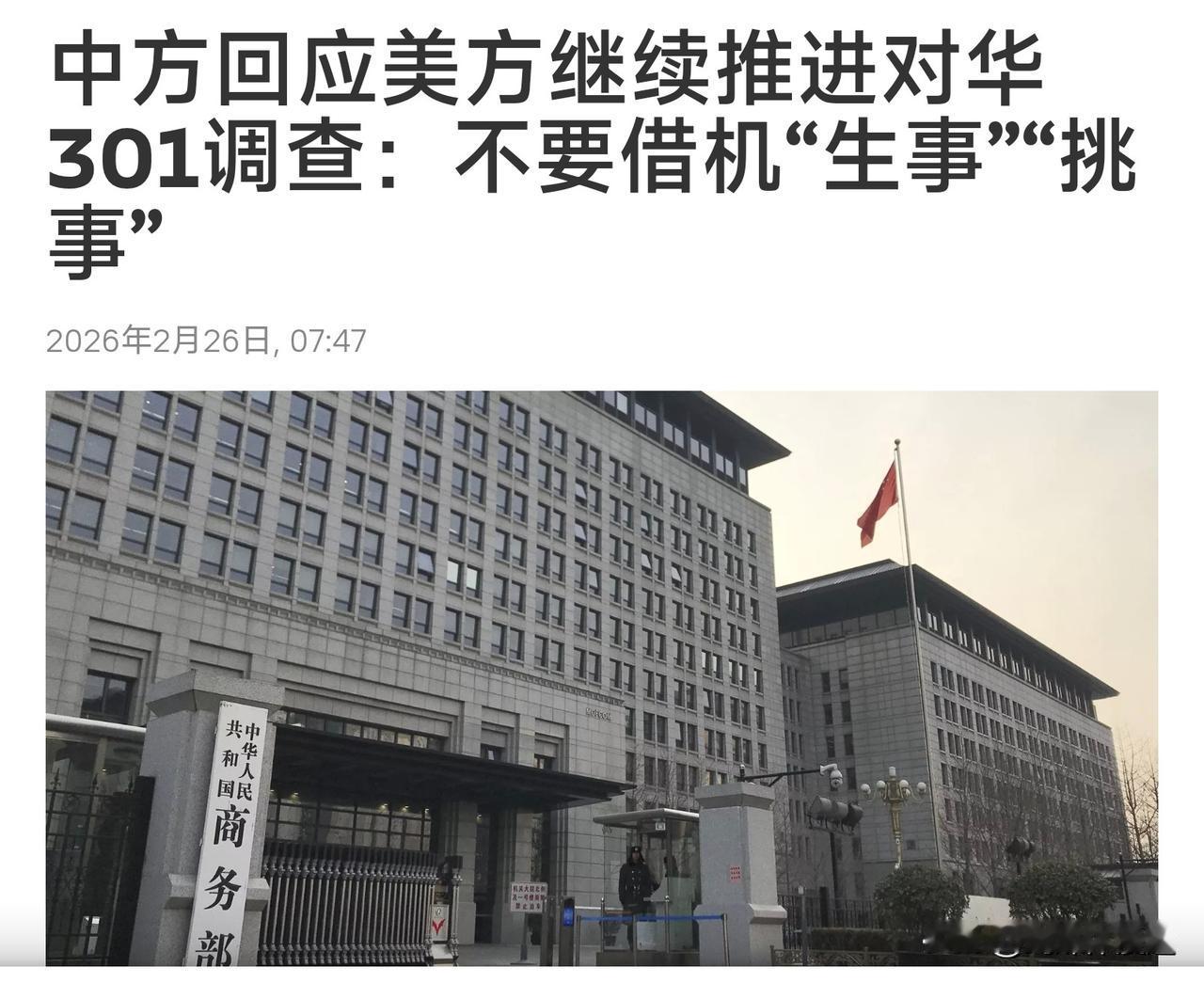 美国对等关税失效后,美国贸易代表企较长利用 301 调查对中国再征税!中方警告美方:不要借机“生事 挑事”!而后美国贸易代表立即出面表示:美国没有对中国加税的计划! 美国最高法院20日公布裁决,认定特朗普政府援引《国际紧急经济权力法》实施的大规模关税政策违法。特朗普随后宣布,依据《1974年贸易法》第122条征收“全球进口关税”,税率10%,为期150天,以取代被最高法院认定违法的关税。同时美国将“全球进口关税”税率将从10%提高到15%,并“立即生效”。接下来几个月里美国政府还要发布新的关税! 中国商务部新闻发言人在就美国最高法院公布关税诉讼案裁决结果答记者问时表示,中方一贯反对各种形式的单边加征关税措施,中方敦促美方取消对贸易伙伴加征的有关单边关税措施。 而就在此时 美国贸易代表还想对中国进行无理的关税的话,这对于 2025 年进行的 5 轮贸易磋商的成果是一种挑战,如果美国单方面对中国施压关税,关于农产品贸易 稀土贸易 投资贸易来说,美国需要掂量掂量。这也就是中方所说的:不要“甩锅推责”,更不要借机“生事”“挑事”。否则中方采取一切必要反制,捍卫自身合法权益! 特别是在特朗普即将要访华的这个时间点,美国敢挑事吗? 美国贸易代表格里尔 2 月 25 日 表示,美国总统特朗普计划于未来数周内访华,目前政府无意将针对中国商品的关税从当前水平上调。 格里尔表示:“美国政府不打算在现有税率基础上进一步升级。我们打算严格遵守我们与中国达成的协议。” 看来中方的警告,让格里尔听懂了!格里尔吓唬谁呢!