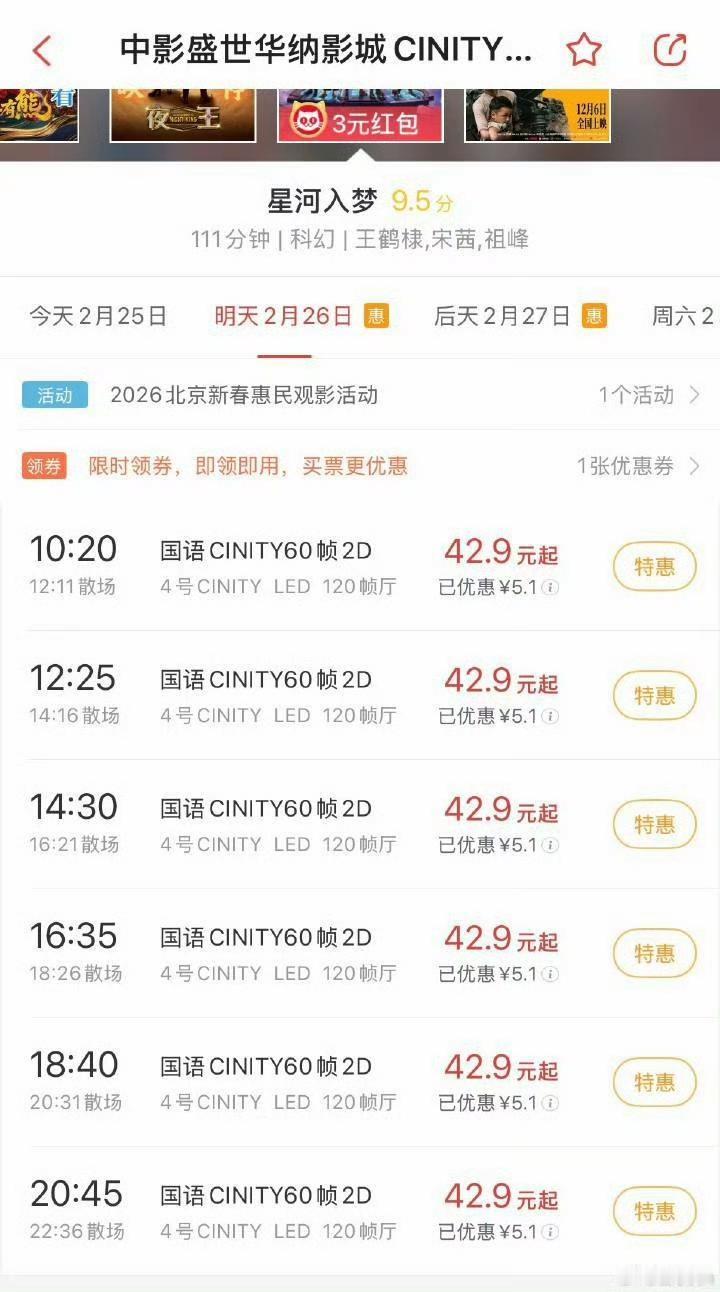 北京,可以看《星河入梦》CINITY,超高清屏幕了。 北京优惠券,10元看一场科幻大片。
