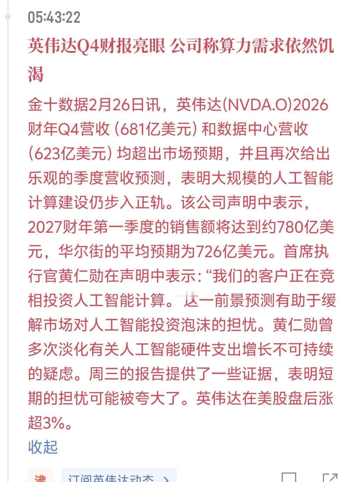 印钞机都没英伟达赚的快 达弟财报不涨已经是预期之中的了,毕竟市值已经相当大了,现在对它的要求就是财报后不要大跌,顺便带带其他的板块。 三星电子今天又新高了,看看cpo会不会也跟着达子的财报涨一波,今年的主线还是铲子股,AI应用这些弟弟往后稍稍吧。