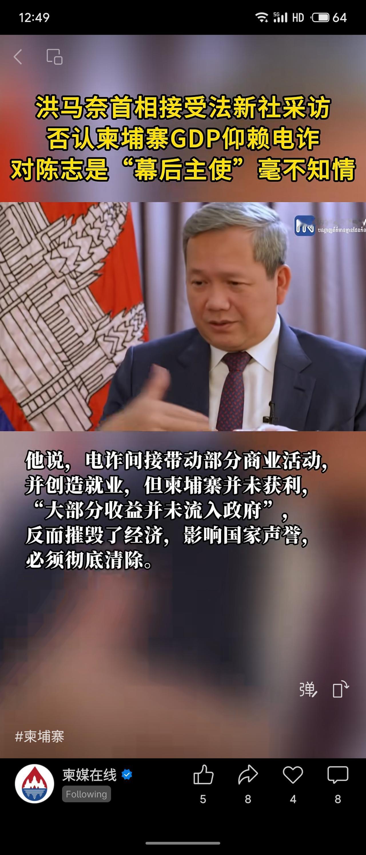 洪马奈否认柬埔寨GDP依赖电诈,称其虽带动部分商业,但政府未获利,反损声誉。对陈志案表示此前不知情。表态强硬但面临治理挑战,如何平衡打击犯罪与避免伤及合法经济,仍需国际社会关注。