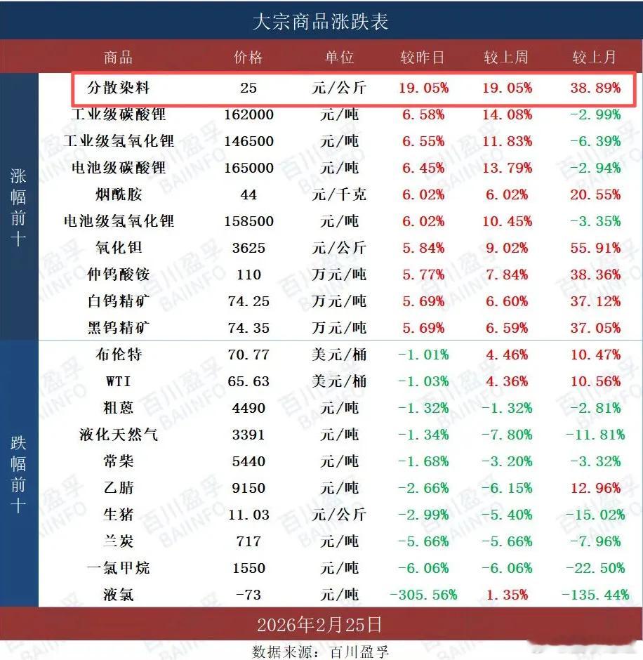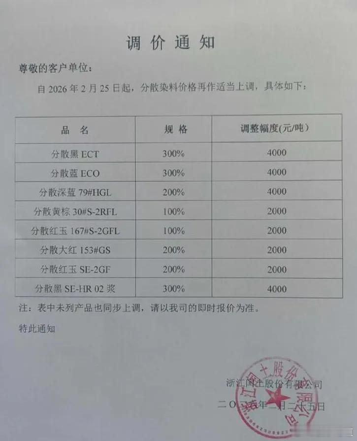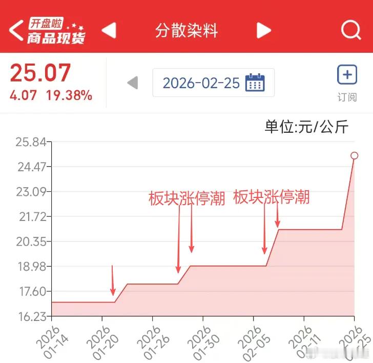 分散染料尾盘大幅跳涨,单日涨幅高达19%!每年2—3月是传统染料需求旺季,叠加当前A股涨价题材成为市场主线,板块情绪持续升温。从历史走势来看,每次产品调价前后,板块均容易出现批量涨停行情,相关价格数据对盘面具有明确指引作用。浙江龙盛:全球染料与纺织化学品龙头企业,分散染料市场占有率超30%,行业龙头地位稳固。公司染料年总产能约30万吨,凭借长期技术积累与全产业链布局,实现高度一体化自给,成本优势与行业壁垒十分突出。闰土股份:与浙江龙盛并称分散染料行业双龙头,两家企业合计占据行业半数以上市场份额。公司染料年总产能近21万吨,其中分散染料产能11万吨/年、活性染料产能8万吨/年,市场份额稳居国内前二,是板块内核心受益标的。今日看盘股票
