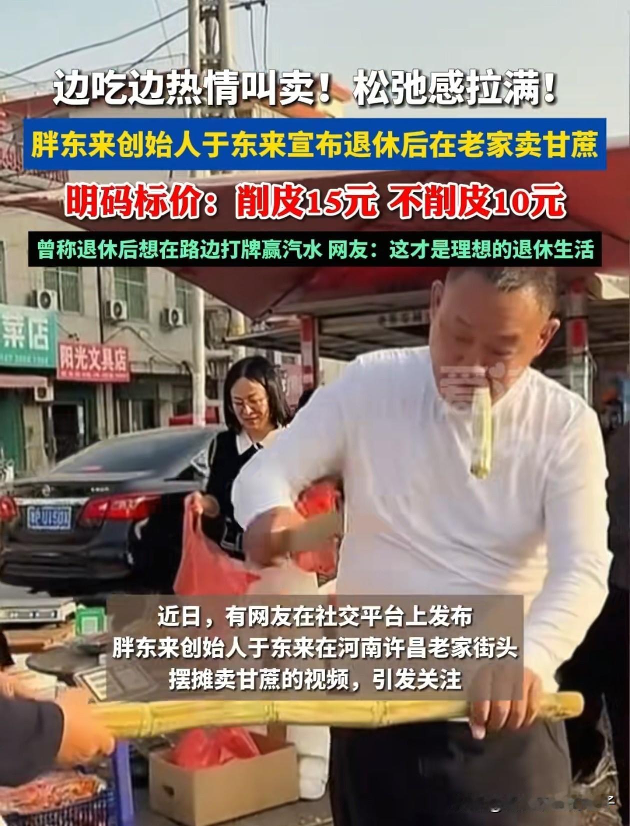 于东来真的退休了!春节期间,有网友在他老家许昌街头,偶遇他帮别人卖甘蔗,于东来买完甘蔗,跟老板聊起生意怎么样,随后就主动帮老板叫卖起来:削皮15块一根,不削皮10块。砍甘蔗削皮的动作,还挺熟练的,一点大老板的架子都没有,看来就算退休了,也闲不下来,总想给自己找点事做。
