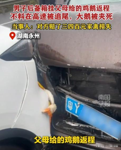 湖北襄阳,一男子返程途中,后备箱挂着的家禽遭遇意外。原本父母给带的鸡和鹅,却因追尾事故全死了,好在追尾车主赔了钱,一只鹅还被带回家吃了,这事真是让人又无奈又好笑。 (来源:杭州日报。南国早报) 胡先生,是襄阳人。 2月24号那天,准备开车回广东上班。 临走前,爸妈往他车里塞东西,塞了4只自家养的鸡和鹅。 不是买的那种,是家里养了挺久的,爸妈觉得外面的不新鲜,想让他带过去补补。 胡先生也懂爸妈的心意,可又怕把它们闷在车里活不成。 琢磨来琢磨去,就把这4只家禽挂在了车的后备箱上,这样通风,不至于闷死。 一路开得都挺顺利,眼看就要到广东了。 开到湖南永州的时候,距离目的地还有300公里。 突然一声闷响,追尾了。 胡先生当时脑子一懵,第一反应不是车坏没坏,是后备箱的鸡和鹅。 赶紧下车去看,心一下子就沉了。 4只鸡和鹅,没一只是活的,全都没了气息。 其中一只鹅最惨,刚好夹在两辆车中间,被撞得变形了。 后车车主也下来了,站在旁边,静静地看了半天,估计也蒙了。 谁也没想到,一场追尾,不光撞坏了车,还撞没了4只家禽。 胡先生看着那些家禽,心里不是滋味。 这不是花钱能买的,是爸妈的心意,是家里养出来的,扔了太可惜。 他就把那只夹在两车间的鹅收了起来,打算带回家吃掉,也算不浪费爸妈的心意。 事故发生后,胡先生没耽误,立马报了保险处理。 后车车主也挺配合,没推卸责任,主动赔偿了三四百元,算是家禽的损失。 胡先生没再多要,事情就这么暂时了结了。 经历过这事,胡先生说,明年再也不带这些活家禽了。 不光麻烦,还让它们遭罪,最后落得这样的下场,心里太难受。 后来他把这事告诉了爸妈,本以为爸妈会心疼那些鸡和鹅。 没想到爸妈第一句话问的是,他有没有事,车有没有大碍。 那一刻,胡先生心里又暖又酸。 爸妈从来不在乎那些东西值多少钱,只在乎他的安全。 追尾导致家禽死亡,后车车主赔偿三四百元合理吗? 追尾导致车载物品损坏,侵权人该不该赔偿。 根据《最高法关于审理道路交通事故损害赔偿案件适用法律若干问题》的解释第十二条规定,因道路交通事故造成车辆所载物品的损失,当事人请求侵权人赔偿的,人民法院应予支持。 也就是说,后车追尾,是后车车主的过错,导致胡先生的家禽死亡,属于车载物品损失,后车车主必须赔偿。 《民法典》第一千一百八十四条规定,侵害他人财产的,财产损失按照损失发生时的市场价格或者其他合理方式计算。 胡先生的家禽是自家养的,不是商品,但也有市场价值,4只鸡和鹅,市场价格大概就是几百元,双方协商赔偿三四百元,也是合理的,没有超出正常范围。 这些家禽是胡先生的合法财产,受损后所有权还是他的,他有权决定怎么处理,只要不违反卫生规定,自己吃掉完全可以,不算违法。 胡先生报了保险,保险会赔吗? 道路交通安全法第七十六条规定,机动车发生交通事故造成财产损失的,由保险公司在机动车第三者责任强制保险责任限额范围内予以赔偿。 家禽损失属于财产损失,在交强险赔偿范围内,保险公司会依法赔付,不足的部分,由有过错的一方,也就是后车车主承担,这也是后车车主只赔偿三四百元的原因,大概率是保险已经赔付了一部分。 大家觉得,后车车主赔偿三四百元合理吗?如果是你,会接受这个赔偿金额吗?一起来讨论一下吧!