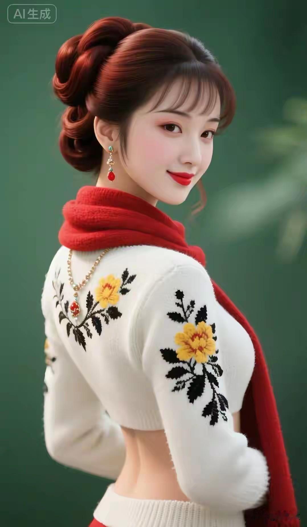 绣花白毛衣,红色花围巾。 清水出芙蓉 ,天然去雕饰。 俏丽佳人,杨柳细腰。 朱唇皓齿,樱桃小口。 沉鱼落雁,闭月羞花。 天生丽质,国色天香。 仙姿玉貌,红粉佳人。
