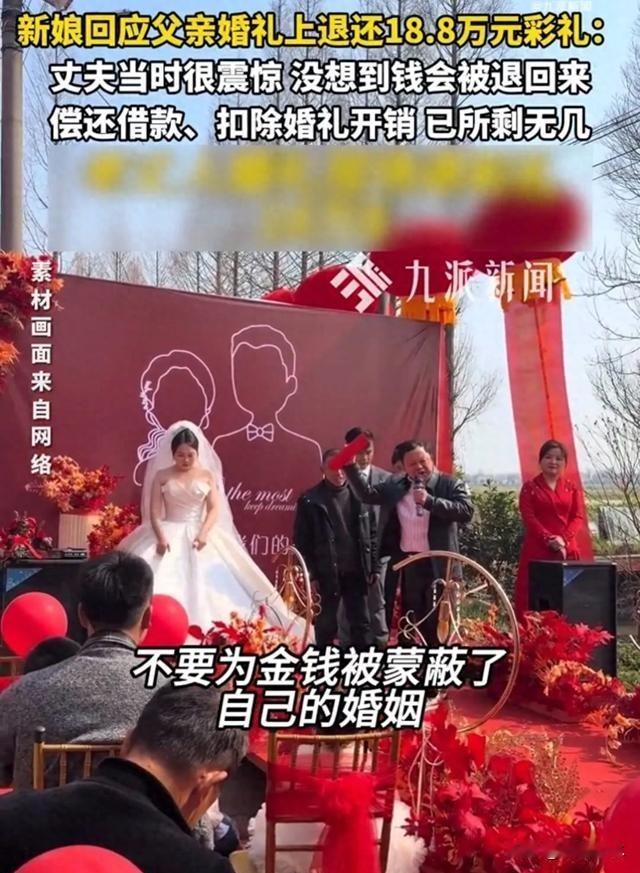 湖南益阳婚礼老丈人当场退18.8万彩礼,只留100,小两口这步走对吗? 湖南益阳,一场婚礼现场热起来了,老丈人把18.8万彩礼原封退给女婿,只留一张100元意思一下,另外还给出12万陪嫁,台下人一愣,台上人也愣,这事你见过吗? 老丈人当着亲友说话不绕弯,年轻人别让钱蒙住婚姻的眼睛,礼数要有,心要更稳,说白了,别把婚事办成一笔账。 这家女儿三十岁,在杭州上班,女婿大一岁,在家乡做水产生意,两人都是南县人,三年前朋友牵线认识,恋爱两年多结婚,路子不算特别长,也不算短,属于很多人常见那种节奏。 订婚那会儿,女方就说不要彩礼,不过,男方还是准备了钱,金额不小,18.8万,数字吉利,图个顺,结果呢,钱里有他攒的,也有借的,公婆年纪大,收入有限,男方扛着面子,也扛着压力,这个你能理解吗? 婚礼当天,钱退回去,女婿很震惊,没想到会这样,接着他拿这笔钱去还了借款,再扣掉酒席酒店车队这些花销,所剩不多,婚礼就是个吞钱的黑洞,大家都懂。 新娘后来说自己不是恋爱脑,她挺现实,这18.8万她也想要,谁不想给小家多留点底,但是看男方的生意这几年不顺,收入不稳,再想想这钱还是他借来的,他后面要跑生意,要周转,要维持家,她开不了口要,选择撤一步,这算不算务实? 很多地方,彩礼是礼数,也是场面,有的会变成布置婚房的预算,有的拿来付婚礼账,有的两家来回走走钱,再合到小夫妻的手里,不同习惯不同玩法,关键还得看两家真实状况,不是吗? 这里还有个点,老丈人不仅退钱,还给了12万陪嫁,陪嫁在民间就是娘家给女儿的底子,家电家具现金都算,简单说,退的是对方的礼,给的是自己的心,方向不一样,态度很清楚。 你可能会问,只留100元啥意思,老话讲个意思,留个吉祥,做人留一线,礼多人不怪,面子过了,里子也稳了,比起数额,关节在心意。 这件事出来,网上议论不少,有人拍手叫好,觉得清醒,有人摇头,说不现实,还有人担心,退了彩礼女方是不是吃亏,说到底,每家账本不一样,每对夫妻的工作收入花销也不一样,谁也难替谁完全做主。 2月25日,新娘对媒体说,爸爸没读太多书,但想法挺新,她也被这一步惊到,男方更惊,这种现场操作,确实少见,不过,把压力先卸一半,对小两口也许是好事,你认同吗?