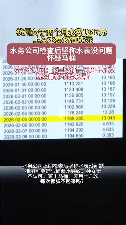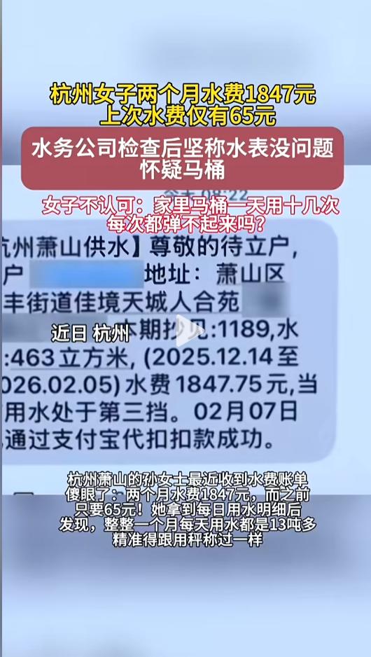 “解释不清了!”近日,浙江杭州,一女子收到家中近两月的水费账单后不淡定了。女子平时家中用水很规律,每个月都是65元左右,可这两个月却翻了28倍,一天顶原来一个月的量,两个月扣了足足1847元水费!网友:家里这是漏水了? 水电费是家庭日常开支的一项重要组成部分,一般情况下,每个月的金额都大差不差,若是这个金额发生了巨大的变化,就说明某个地方可能出问题了。 据媒体2月25日报道,孙女士家中平时用水都很稳定,每次扣费都在65元左右,可近两个月的水费却涨上了天,账单显示竟要1847元。 孙女士一下子就懵了,她和丈夫天天在家,用水没有异常,怎么账单变的这么离谱呢?她赶紧联系了供水公司,并且进行了投诉。 供水公司检查过后,说水表完好,没有问题。水表是机械表,只有水流通过才会转动。他们怀疑是孙女士家中马桶出了问题,出现了持续性漏水。 孙女士当即提出了反驳,她说家里的马桶一天用十几次,不可能次次弹不上来。 后来,孙女士又仔细查看了每日的用水量,她发现近两个月来,每天的用水量都在十三点几吨,每天都相差无几,跟用秤称过的一样。可自从她投诉过之后,连续两天用水量降到了四点几吨,随后就恢复原来正常的数值了。 孙女士怀疑是供水系统出现了问题,要求供水公司退还多余的费用,可供水公司却说水表是精确地,必须按那个量收费,双方各执一词,争执不下。 网友看后表示,这个账单确实奇怪,每天用水量这么大,系统没有预警么?希望双方还是能好好沟通,尽快查明真相,避免业主的损失。也提醒大家,多关注家里的用水状况,万一出现隐蔽漏水也好及时止损! 信息来源:《两个月水费1847元水务公司怀疑马桶(1818黄金眼)》半岛晨报