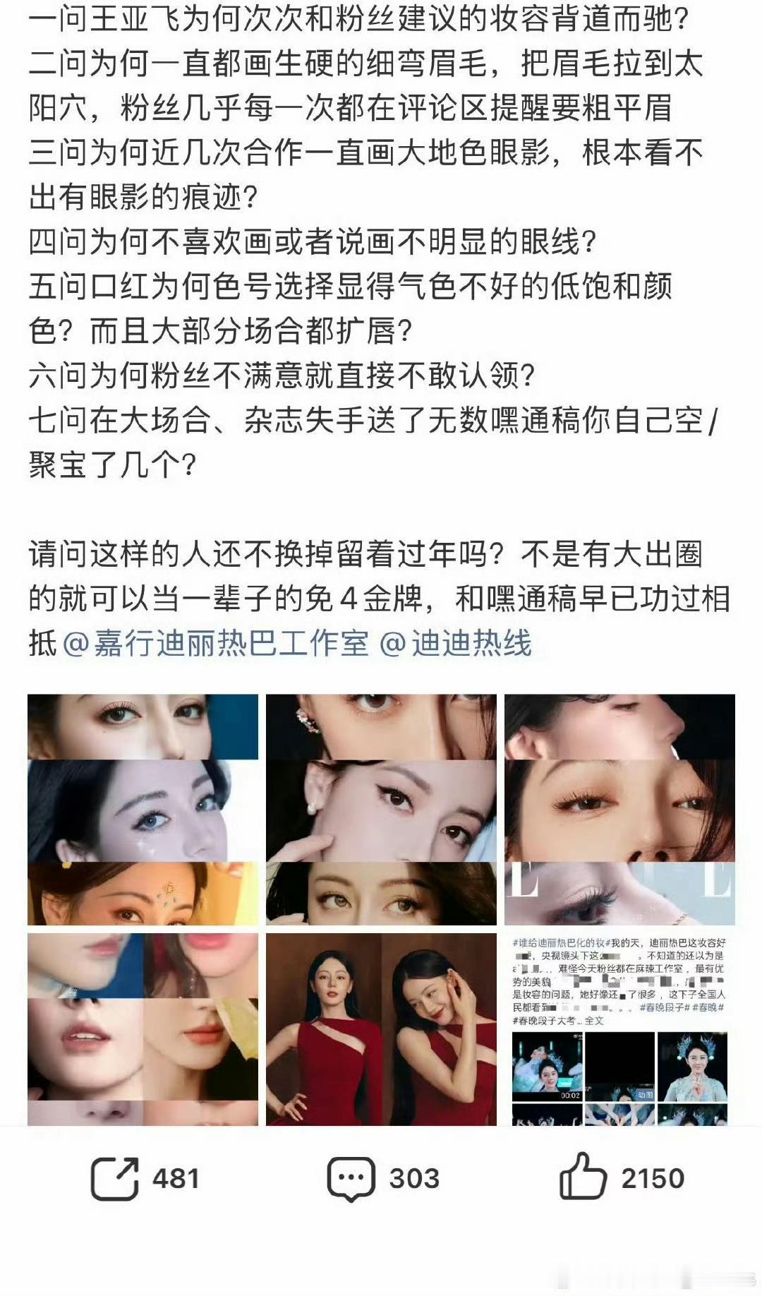 迪丽热巴冲上热搜!迪丽热巴今年春晚的一个舞台妆,居然发酵到现在还没停,合作6年的御用造型师王亚飞,直接被粉丝推上了风口浪尖。 事情的导火索,正是2026年央视春晚宜宾分会场的舞台。当晚迪丽热巴配合水下主题,打造了一套“人鱼姬”造型:王亚飞为她设计了珠光蓝调眼影、眼下碎钻点缀,搭配裸色唇妆,本意是贴合舞台,营造深海精灵、波光粼粼的氛围感。 单看精修俯拍图,光影交错间确实有那股灵动劲儿,不少官媒和普通观众也夸造型贴合主题、有新意。可这套妆,在迪丽热巴粉丝这里,直接翻了个底朝天。 在粉丝眼里,这个妆非但没放大热巴的浓颜优势,反而成了致命减分项。央视4K高清镜头无死角一怼,问题全暴露了:蓝眼影晕得脏兮兮的,修容几乎等于没做,整张脸看着浮肿又没精神,完全没撑住她最出圈的立体骨相。 更别说粉丝直接翻出去年同是王亚飞操刀的春晚“红石榴妆”对比——去年那套红唇浓眉,把她的明艳大美人气质拉到极致,一出场就全网刷屏;今年这套,裸色唇直接把气色拉到谷底,连眼里的灵气都像被磨没了。 争议越闹越大,粉丝的怒火也从妆容本身,精准对准了造型师王亚飞。 迪丽热巴粉丝七问王亚飞的话题直接冲上热搜,大家把憋了快一两年的不满,字字句句都砸了出来: 一问王亚飞为何次次和粉丝建议的妆容背道而驰? 二问为何一直都画生硬的细弯眉毛,把眉毛拉到太阳穴,粉丝几乎每一次都在评论区提醒要粗平眉? 三问为何近几次合作一直画大地色眼影,根本看不出有眼影的痕迹? 四问为何不喜欢画或者说画不明显的眼线? 五问口红为何色号选择显得气色不好的低饱和颜色?而且大部分场合都扩唇? 六问为何粉丝不满意就直接不敢认领? 七问在大场合、杂志失手送了无数黑通稿,你自己空评/举报了几个? 粉丝一条条列着过往的“失误案例”,直言王亚飞的审美早就跟不上热巴的状态,甚至一直在拖后腿。 光吐槽根本止不住怒火,粉丝直接把抵制摆到了台面上。眼看着巴黎时装周就要启动,大家全跑去工作室评论区刷屏,死磕要求必须换掉王亚飞,点名要之前把热巴骨相美焊在脸上、口碑爆棚的化妆师金鹤龙接手。甚至有粉丝账号透露,金鹤龙愿意调整档期配合,即便这个消息没得到任何官方证实,也彻底点燃了粉丝的情绪,王亚飞 迪丽热巴相关话题的声量一路飙高。 更有粉丝直接在评论区喊话工作室:“再装瞎试试,因为王亚飞导致迪丽热巴被严重造谣,这个后果谁来承担?永拒王亚飞,是永拒。” 这事闹大之后,网友直接吵成了一锅粥。 站粉丝的网友觉得完全没毛病:“真不是粉丝事多,王亚飞这两年的妆是真的越来越拉,热巴最出圈的就是明艳大美人的路子,他非要往寡淡了画,谁看了不心梗?” 但也有路人完全不理解:“春晚的妆是要配合舞台的啊,水下主题人鱼妆本来就要贴合场景,粉丝管得也太宽了,难不成比专业造型师还懂?” 还有人调侃:“一边吹自家姐姐颜值天花板,一边说一个妆就毁了,到底是对她的脸有信心还是没信心?” 其实这场风波,从来都不是“一个妆好不好看”的小事,而是粉丝和艺人团队之间,攒了整整6年的审美话语权之争,终于彻底爆发了。 王亚飞跟热巴合作了6年,早年确实出了不少封神的出圈神图,他的风格更偏向跟着活动主题做艺术化表达,想靠妆造讲故事;但粉丝要的从来不是什么“艺术试验品”,她们要的是热巴每一次公开露面,都把她最能打的明艳特质拉满,浓眉红唇、清晰骨相,半分都不能少。 说白了,这就是“艺术创新”和“个人特质最大化”的正面撞车。春晚的镜头限制、水下舞台的灯光要求,确实是客观问题,但对一路跟着热巴走过来的粉丝来说,她们接受不了任何一点可能让偶像“掉链子”的细节——更何况,这已经不是第一次翻车了,不满攒到临界点,爆发是迟早的事。 直到现在,迪丽热巴工作室依旧全程沉默,即将到来的巴黎时装周,到底用不用王亚飞,成了所有人盯着的最大悬念。 其实不管最后换不换人,这件事都给所有艺人团队提了个醒:粉丝的诉求和专业团队的判断,从来都不该是对立的。好的妆造,从来都是既能贴合场景,又能放大艺人的特质,是双向成就,而不是一边执着于“艺术试验”,一边死守着“稳妥不出错”,最后闹成两败俱伤的消耗。