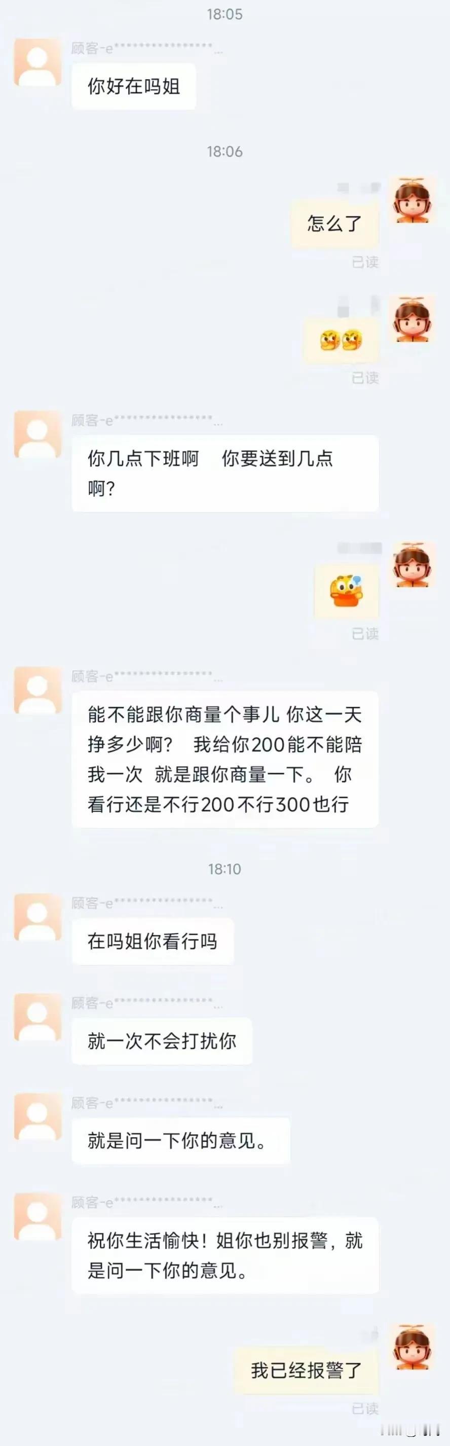 色胆包天男子点外卖见女外卖员漂亮,多次发信息要求其答应“有偿陪伴”被警方拘留。事发2月22日下午18点左右,在上海市某小区,26岁的年轻女骑手小葛(化名),根据顾客的订单正在爬楼派送,正爬到五楼时发现该男顾客已经站在楼梯口。 随后小葛就将外卖递给这名男顾客后立即离开,准备送其他订单,但是手机开始不断收到这名男顾客的骚扰信息。该顾客询问小葛跑一天的外卖能够收入多少?并提出自己给她200元,希望小葛可以“陪伴”自己一次。 小葛没有回应,随后该男子不断骚扰她,并表示“给你300也行,就玩一次就行”,后来看小葛没有回应,他又表示不要报警。结果小葛表示受到了骚扰,已经报警。随后警方陪同小葛找到这名21岁的男子,要求其道歉,并且小葛要求不需要赔偿,对其进行法律惩罚。 随后警方根据相关治安条例对这名男子做出了行政处罚,并且告诫广大市民:通过电话、信息等多次骚扰他人,影响他人正常生活的,可以处以5日以下拘留或者500元以下罚款;如果有严重强制猥亵行为或者导致严重后果,将涉嫌犯罪。 美女外卖员被男子多次信息骚扰 男子发信息给200元让女外卖员陪一次被拘留