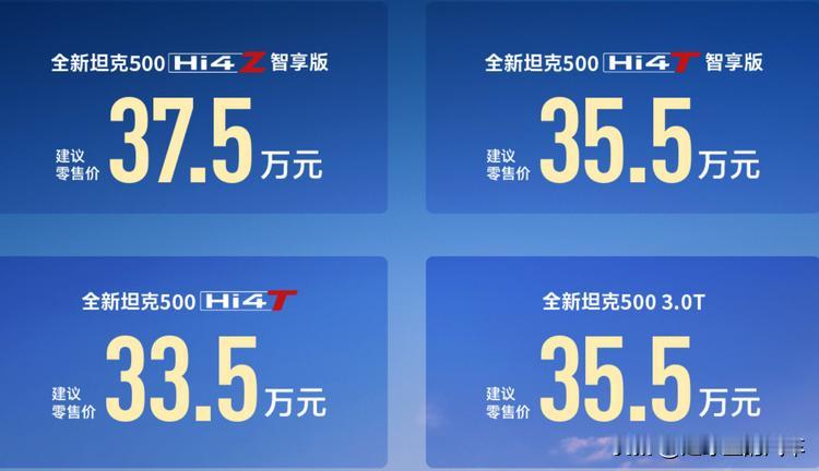毕竟坦克500定位比较特殊,它是硬派越野+豪华舒适+家用全能的六边形选手,如果你没钱,就不适合你买。 核心亮点1:3.0T V6发动机,大排量强动力,而且还是非承载车身,Mlock机械锁+三把锁,越野能力,强过普拉多/陆巡。 核心亮点2:Nappa真皮、全座椅通风/加热/按摩、车载冰箱、双层玻璃+ANC降噪,无论是实打实的配置,还是用户体验后的感知,这些配置无不让人叫好称赞。 核心亮点3:Hi4-T纯电110km、Hi4-Z纯电201km;市区通勤0油耗,亏电油耗约8.8-10L,比纯油版省太多;而且三电终身质保,无里程焦虑,也不用担心产品性能。 总结:坦克500是30-40万级,唯一能同时满足“硬派越野+豪华舒适+家用+绿牌”的全能SUV。 只要你有钱,何不尝试一把呢?坦克500