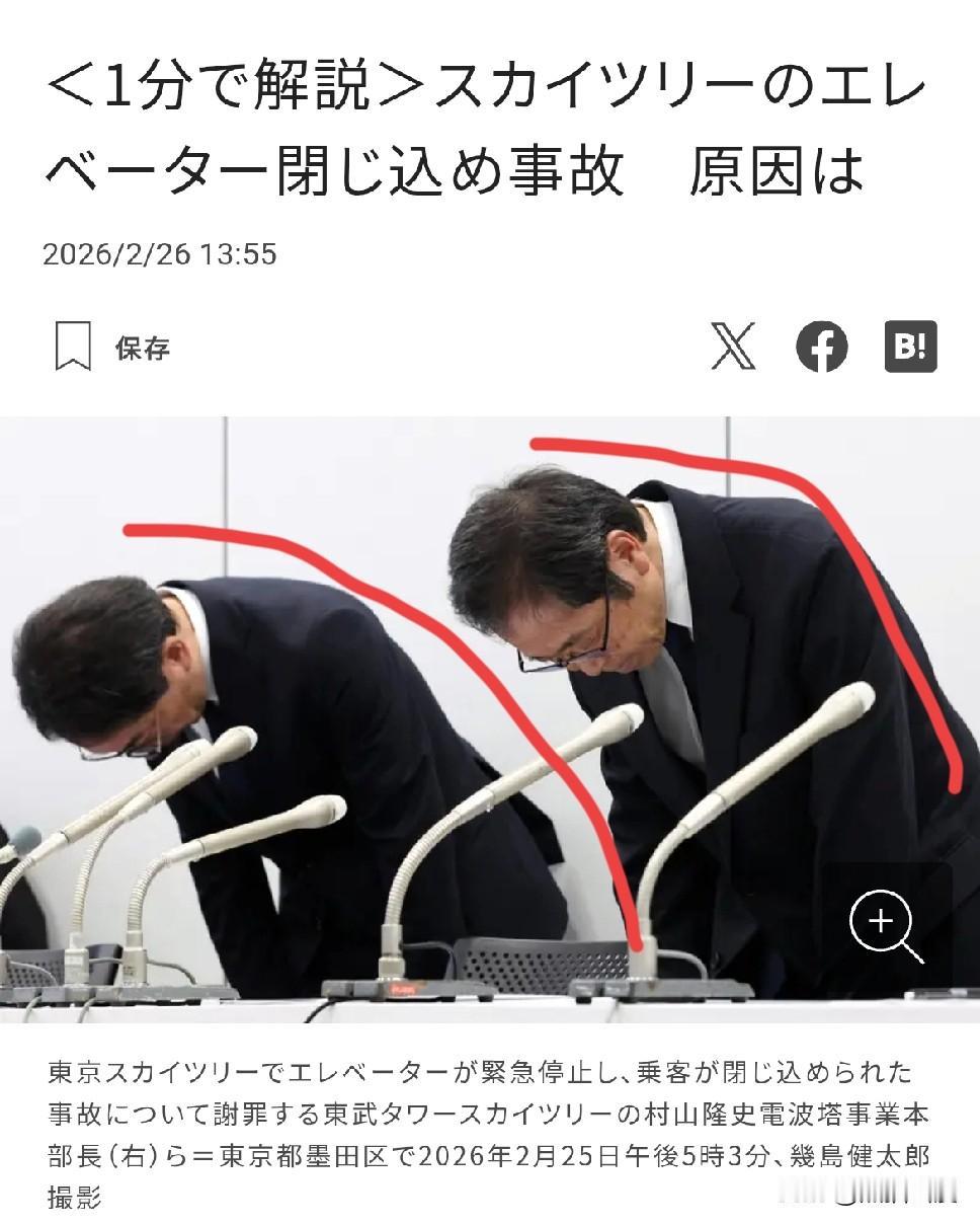 半空30米,20人滞空5个小时。 东京晴空塔发生紧急故障,导致20名乘客被困的电梯5小时。观景台上的1200名游客同样被困2小时左右不等。 原因终于确认,是东芝电梯的电缆卡在了导向装置上,直接断了。他们调查了4天,才给出这份答案。 原因解释完了,管理层鞠躬道歉,事情结束。