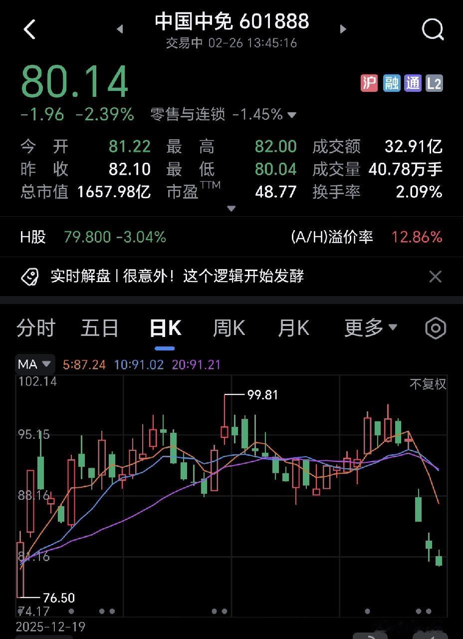中国中免这波连续大跌,真的超出太多人预期,砸了三天了。 很多人都在盼明天能不能企稳? 我同学之前还看好它冲上百元,重仓进去,现在直接被套牢,一直问我还能不能起来?心态明显急了。 大家觉得这只股还有希望吗?中国中免 中免全球 中免全球悅享季 中旅中免 海口中免