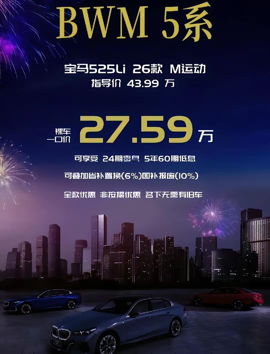 宝马5系,面子掉地上了。 以前你凑近50万才摸得着,现在27万开走。 去年8月卖7989台,今年1月飙到12976台。 它被电车逼到墙角,自己把身段踩进了泥里。 525Li这个版本,宝马曾经想扔掉。 那时它起步就是530Li,47万裸车对标奔驰E。 现在它乖乖请回525,价格一路跌穿28万。 谁也没想到,曾经站在豪华车顶端的宝马5系,会用这种方式抢回市场。过去这款车是身份的象征,价格硬气到几乎不打折,多少人攒钱好几年,就为了开上一台蓝天白云标的C级车。如今经销商报价一路下探,27万多就能提走525Li,这个价格放在前几年,连3系中配都未必拿得下来。 销量暴涨不是因为产品突然质变,而是价格击穿了所有人的心理预期。去年年中销量一度跌到不足八千台,宝马高层一度打算砍掉入门版,专心推更高利润的530Li。国内新能源品牌轮番冲击,配置、智能、用车成本全面领先,传统豪华车再不低头,只会被慢慢挤出主流赛道。宝马这才紧急重启525Li,用低价换生存,这是无奈,更是现实。 2026年购置税政策调整,成了压在电车身上的一块石头。30万级别的电车要多交一万多税费,算上保险上牌,落地价反而比降价后的宝马5系更贵。普通家庭买车最看重真金白银,一笔账算下来,没有续航焦虑、品牌更有面子的5系,成了更多人的首选。 网友的评价格外真实,老车主直呼心疼,当年五十多万落地,如今一半价格就能新车开回家,保值率直接腰斩。准备买车的人则觉得这是抄底好机会,花雅阁凯美瑞的钱,开上宝马5系,面子里子都到位。也有业内人看得透彻,宝马靠降价换回销量,却在一点点消耗几十年积累的高端形象。 宝马5系的降价,本质是传统豪华品牌在电动时代的妥协。靠价格战能赢一时,赢不了长久。车市早就变天了,消费者不再只看车标,更看重体验、技术与性价比。宝马5系G38 宝马5系g38 宝马g385系 宝马5字车标 宝马5l 五系车 宝马5款 宝马5i系 你觉得现在27万的宝马5系值得入手吗,还是会继续等更便宜的价格?