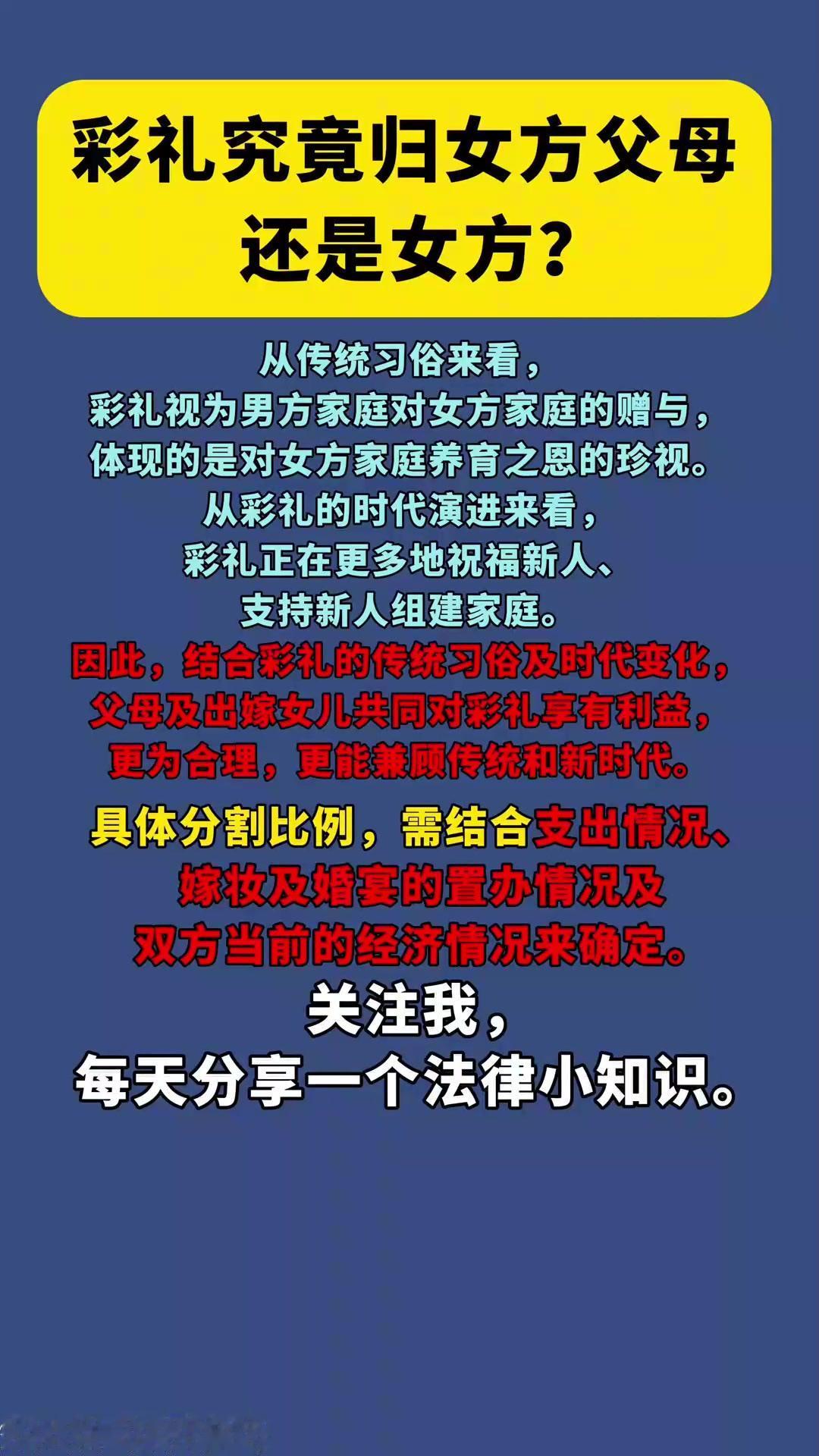 彩礼到底归女方父母还是女方本人?法律早有答案,别再糊涂了! 结婚谈彩礼,最扎心的不是给多少,而是钱到手该归谁。一句“我养你这么大彩礼理应归我”,让多少女儿在婆家与娘家之间左右为难;一句“这是给小家庭的启动金”,又让多少父母觉得寒心不被体谅。彩礼之争,争的从来不是钱是偏心、是底气、是未来的安全感。 从法律层面说,彩礼是男方以结婚为目的,对女方的赠与,本质上属于女方个人财产,并非父母的“养老钱”“卖女钱”。现实中不少判例显示,只要领证共同生活,彩礼原则归女方;即便父母代收,也无权擅自截留。可偏偏在人情世故里,法律常常败给“传统”。 有人说,父母养女二十余载,要点彩礼不过分。但养女儿是责任,不是投资;嫁女儿是祝福,不是交易。真正拎得清的父母,只会把彩礼当成女儿的底气,要么原封不动给小家庭,要么添点陪嫁一起送回去,生怕女儿在婆家受委屈。 最怕的是,父母拿着彩礼给儿子买房、当养老本,完全不顾女儿刚组建家庭的艰难。多少姑娘,带着一身委屈出嫁,还没进门就先寒了心,婆媳矛盾、夫妻隔阂,往往从这笔钱就埋下伏笔。 彩礼的归宿,藏着一个家庭的三观。归父母,是恩情;归女儿,是疼爱。最好的结局,从来不是某一方独占,而是父母不贪心、女儿有底气、婆家有尊重,一起给小家庭铺路。 别让彩礼,成为摧毁婚姻的第一块石头钱可以谈,情不能伤;理可以讲,心不能凉。