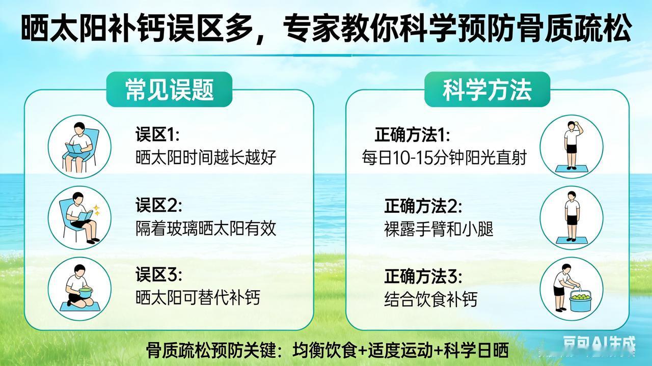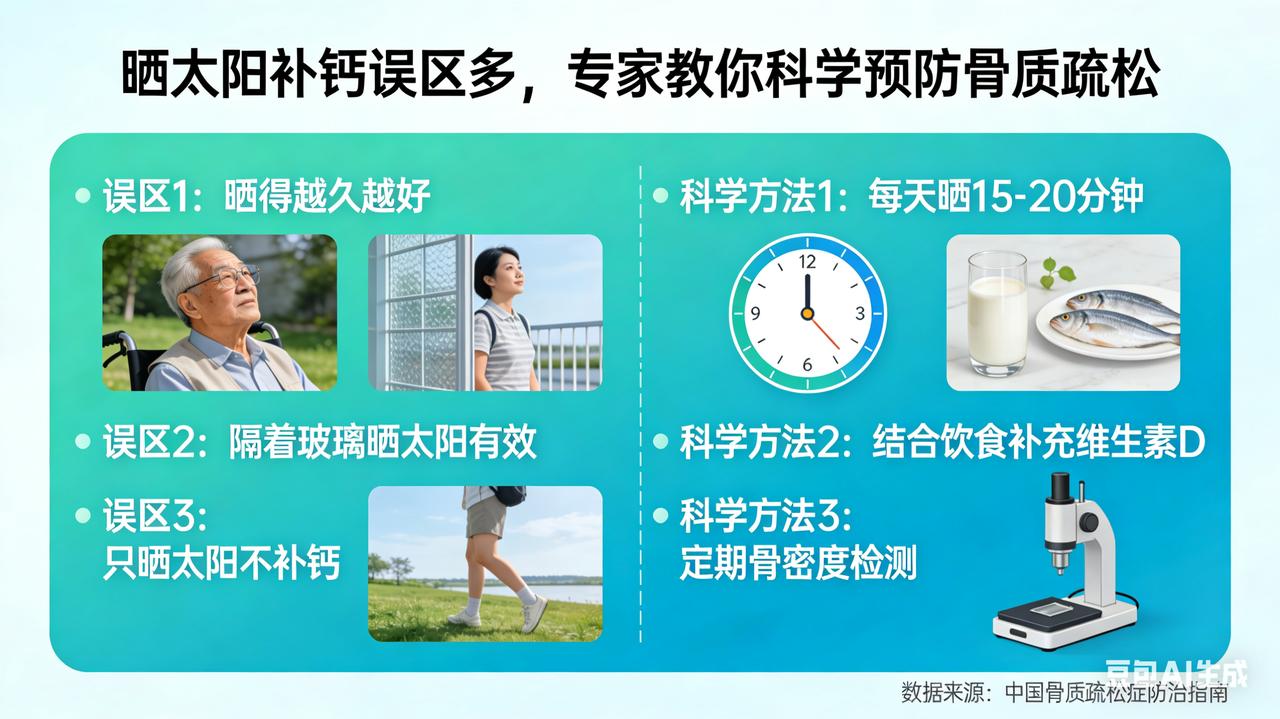 晒太阳补钙误区多,专家教你科学预防骨质疏松 晒太阳防骨质疏松?冬季无效?专家解锁科学晒法,让骨骼“硬”起来! 在人生的旅程中,健康如同基石,支撑着我们追逐梦想、享受生活。然而,骨质疏松症却像一位潜伏的“健康刺客”,悄无声息地侵蚀着中老年人的骨骼,让原本坚固的“人生大厦”摇摇欲坠。不过别担心,有一种天然且经济的预防方式——晒太阳,正悄然为我们的骨骼健康保驾护航。但坊间流传“冬季晒太阳几乎无效”,这究竟是危言耸听,还是确有其事?又该如何科学晒太阳,让骨骼真正“硬”起来呢? 晒太阳之所以能预防骨质疏松,奥秘就藏在阳光中的紫外线B(UVB)里。它就像一位神奇的“魔法师”,能刺激皮肤合成维生素D。而维生素D,堪称钙吸收的“黄金搭档”,是骨骼健康的“幕后英雄”。它就像一把精准的钥匙,能打开肠道对钙吸收的大门,让钙元素顺利进入血液,再被运输到骨骼,助力骨骼进行矿化,让骨骼变得更加坚硬密实,如同为骨骼穿上了一层坚固的“铠甲”。倘若长期缺乏维生素D,即便每天摄入充足的钙,身体也难以有效利用,钙就像无家可归的“流浪儿”,无法发挥应有的作用,骨质疏松的风险便会大大增加,骨骼也会变得脆弱不堪。 然而,冬季晒太阳的效果却大打折扣。冬季,太阳如同一位慵懒的“睡美人”,高度角变得很低。阳光需要穿越更厚的大气层才能抵达地面,这一过程中,UVB就像一位勇敢的“闯关者”,被大量过滤,到达地面的含量显著降低。而且,冬季人们为了抵御寒冷,纷纷穿上厚重的衣物,身体大部分皮肤被严严实实地遮盖起来,进一步阻碍了维生素D的合成途径,让晒太阳预防骨质疏松的作用变得微乎其微。 那怎样晒太阳才科学有效呢?专家为我们送上了详细的“晒太阳秘籍”。在时间选择上,春秋季阳光温和宜人,上午10点到下午3点,阳光中的UVB含量处于较高水平,就像一场维生素D的“盛宴”,每次晒20 - 30分钟为宜,让身体尽情享受阳光的滋养;夏季阳光强烈似火,为避免晒伤,可选择上午9 - 10点或下午4 - 5点,这两个时段阳光相对柔和,晒15 - 20分钟即可,既能补充维生素D,又能避免皮肤受损;冬季阳光稀缺而珍贵,应选择中午时段,此时阳光相对充足,尽可能延长晒太阳时间至30 - 40分钟,让身体在有限的阳光中获取更多的维生素D。部位方面,尽量多暴露皮肤,如手臂、腿部、面部等,让阳光充分接触皮肤,就像给皮肤做一场温暖的“按摩”,但要注意保护眼睛和头部,可佩戴遮阳帽、太阳镜,避免阳光直射造成损伤,就像给眼睛和头部撑起一把“保护伞”。地点最好选择空气清新、阳光充足且没有遮挡的户外,如公园、广场等,在这里既能享受阳光的沐浴,又能呼吸新鲜空气,仿佛置身于一个天然的“健康氧吧”。 此外,并非所有人都适合长时间晒太阳。光过敏者、服用光敏性药物者以及患有某些皮肤疾病的人群,晒太阳可能会引发过敏反应或加重病情,就像在脆弱的皮肤上“火上浇油”,需在医生指导下进行,确保晒太阳既能促进健康,又不会带来伤害。 从现在开始,让我们走出家门,拥抱阳光,用科学的方法晒太阳,为骨骼健康筑起一道坚固的防线,让我们的生活更加充满活力!