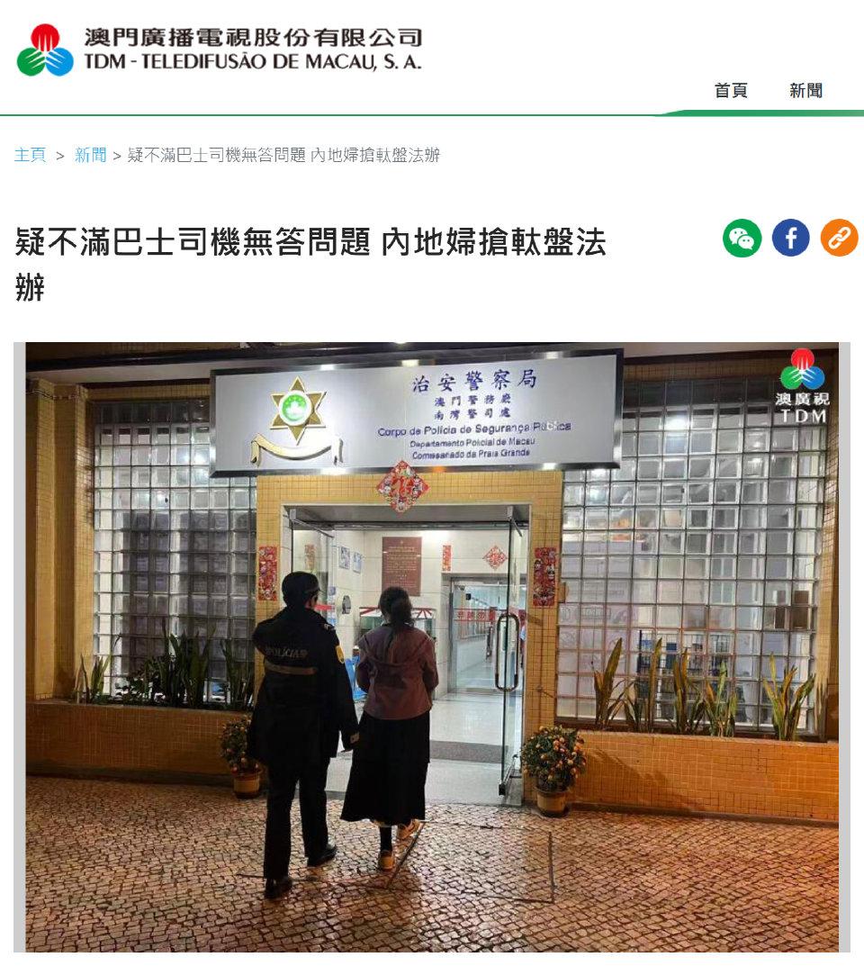内地妇人乘坐巴士抢司机方向盘被捕 一位60岁内地女子乘坐巴士期间,不满意司机没回答她对于线路的查询,居然抢夺行驶中巴士的方向盘,事件中没有乘客受伤,涉事女子涉嫌妨害道路运输安全罪,被移送法办。 事发于大年初二(18日)晚上 7时许,嫌疑女子搭乘 3X巴士前往关闸,巴士途经新马路中银时,她怀疑不满司机没有回应路线问题,在巴士行驶期间伸手抢夺方向盘,导致车身摇晃。 治安警称,司机紧急将巴士停在行车道上,响咹通知附近的巴士公司稽查员上车协助,并由稽查员陪同嫌疑人下车报警,巴士则先行离去,避免影响其他乘客。事件扰攘约 10分钟。