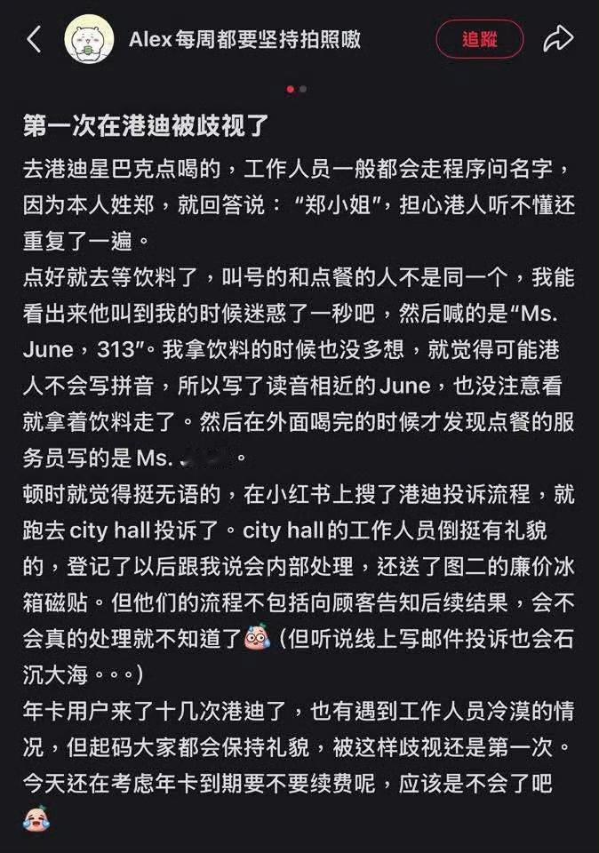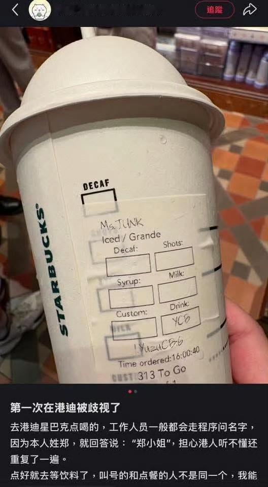 把顾客的名字写成垃圾,这是故意还是无知? 在港迪游玩的郑小姐,期间在星巴克购买饮料,发现店员把她的名字写成:Ms Junk。 不知道店员是否故意,但就算怎样,也不会犯如此低级错误! 她进行投诉,但感觉港迪的处理方式不妥,于是发帖,来了十几次,第一次被歧视!