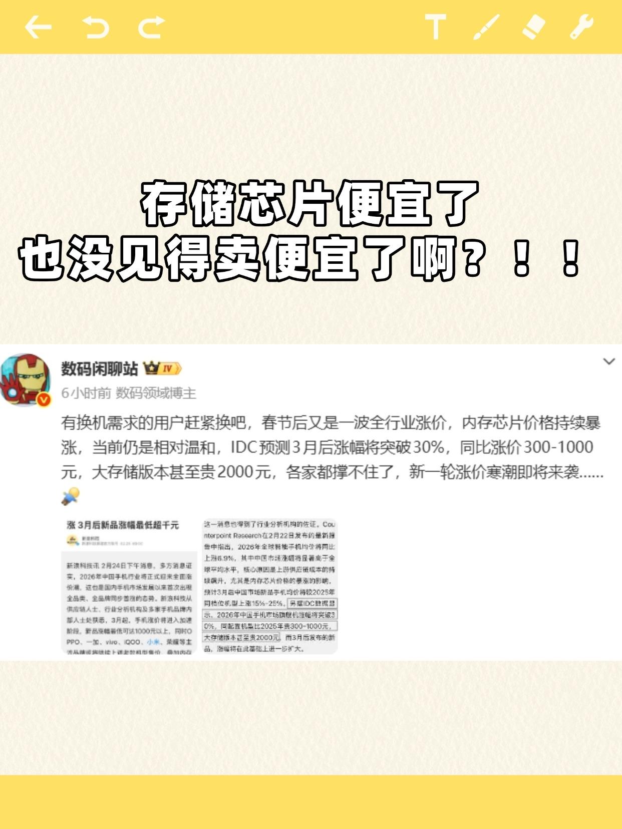大V数码闲聊站透露,春节后是一波全行业涨价,受内存涨价的因素,手机也会跟着涨价一波,建议有换机需求的赶紧换。 我寻思以前存储芯片没涨价的时候,国产手机的价格不也一直在上涨??