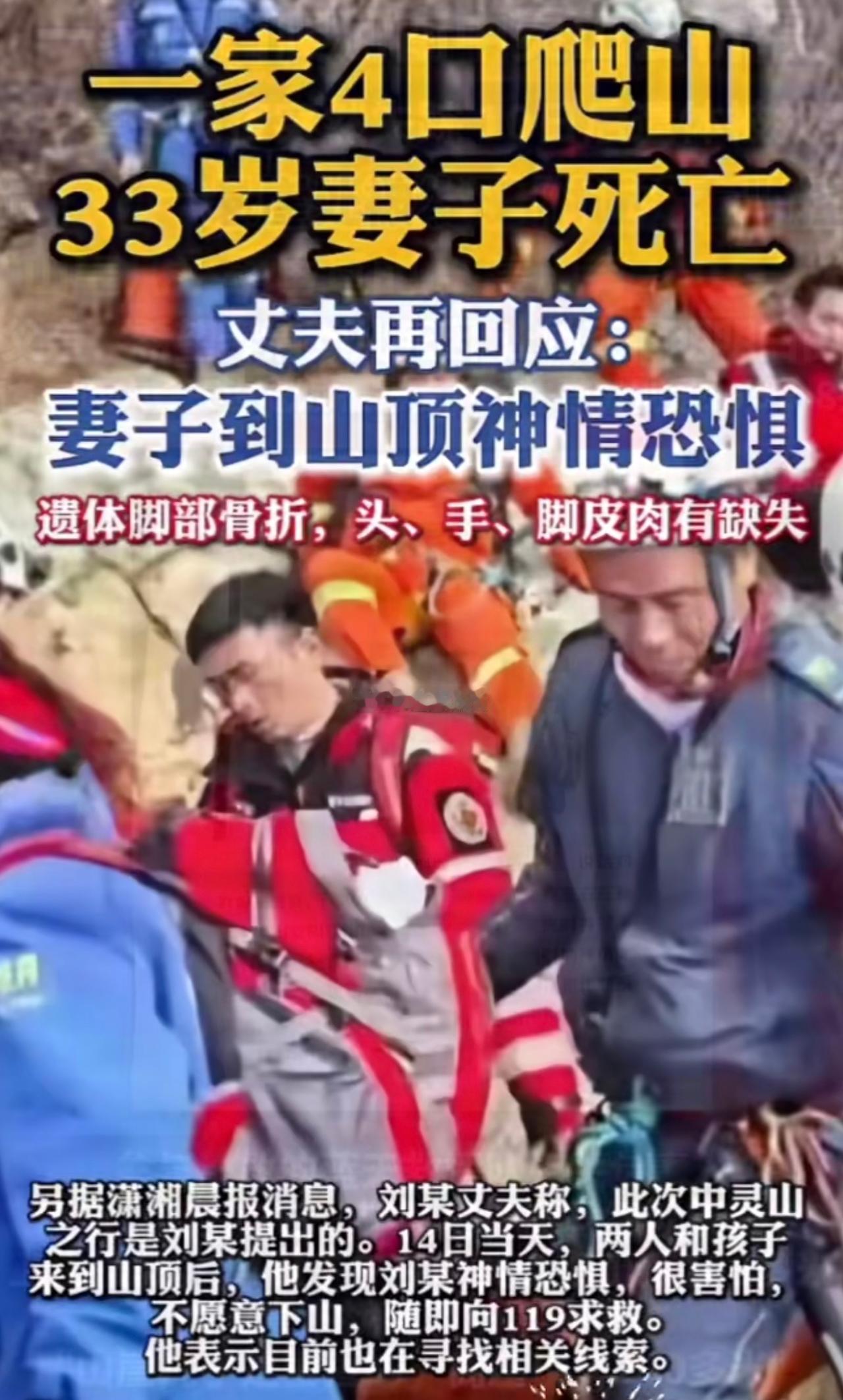 重庆33岁女子大过年跑河南中灵山寻死,怎么看都透着诡异。2月14腊月27日,年都不过,拖家带口急匆匆从重庆老家赶往河南洛阳中灵山祈福,女子出发的时候穿的睡衣,脚上穿的高跟鞋,明明是出远门,还要爬山,为啥不多带一双鞋,爬山也是高跟鞋,爬到半路,竟然光脚,中灵山按照海拔肯定在零度以下,脚踩在冰冷的石头上受得了?这不合常理。深更半夜爬到山上,没吃没喝,关键是一家人还不一起,老婆带孩子走前面,老公带孩子走后面。到了山上,老婆就精神出问题,然后老婆就失联了。直到2月24日,才在一处山崖下找到女子的尸体。老公真的说实话了吗?到底是老婆要去祈福,还是老公要去的。河南轻生事件