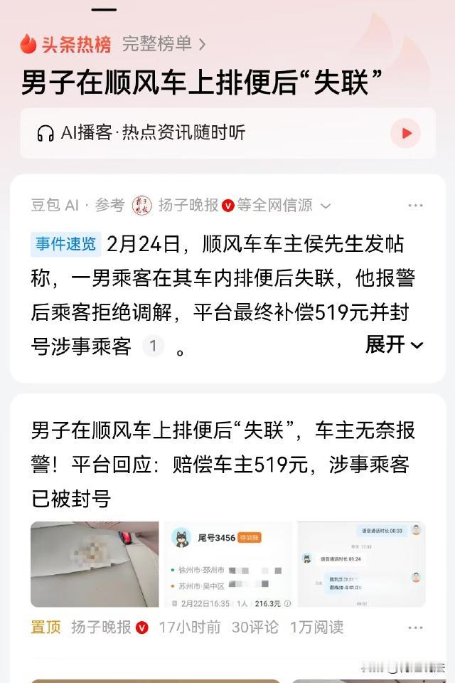 赔大了!山东一男子返程上海,路上接了一单顺风车,全程11小时,乘客付了216.3元,半路上乘客在他后座拉屎,男子以为乘客晕车吐了,乘客还不承认,男子没在意,直到回到上海,一拉开后门,男子发现后座上一摊黄黄的污渍,差点把他熏吐了! 据九派新闻报道,侯先生是山东人,在上海上班。2月22号,侯先生过完年自驾返回上海,半路上接了两单顺风车。 其中一单是一个男乘客,看着有40多岁,是从徐州到苏州的,当天下午4点35分从邳州上车后,他一直一个人坐在后排。 因为春节非常堵,侯先生全程跑了11个多小时,半路上,侯先生问男乘客需不需去服务区上个厕所,乘客说不用。 但是侯先生越开越觉得不对劲,特别是凌晨2点钟之后,车里隐隐约约传来一股臭味。 侯先生最开始还以为是乘客放了个屁,但是这股味道越来越浓,一直没有消散。 后排男乘客也坐不住了,一直扭来扭去的,还让侯先生把窗户打开,侯先生从后视镜里看了看,问他是不是晕车吐了。男乘客说没有,只说想开窗透透气。 期间,这个顾客一直抽纸巾,还不停往窗户外面扔东西,侯先生还以为开窗把他冻感冒了,他在擤鼻涕,还问他需不需要把窗户关上,乘客拒绝了。 侯先生没再管他,一路专心开车,直到第二天早上6点钟左右才把这名乘客送到了苏州市的某产业园。 送完乘客后,侯先生转身继续赶往上海,到达目的地后,侯先生开始收拾车上的东西,往下拿行李。 拉开后车门后,胡先生闻到了一股刺鼻的臭味,那个味道很浓,差点把侯先生熏吐了。 他仔细一看,车后排的坐垫上有一滩黄色的可疑物,臭味就是从那里传出来的,车后排放的湿纸巾也被用了半包。 侯先生顿时一阵恶心,原来,那名男乘客拉他车上了。 侯先生终于明白了,半路上那名乘客为什么举止这么奇怪,原来他拉了裤子,排泄物从衣服渗到他的坐垫上,所以男乘客在一直偷偷的抽纸巾擦坐垫。 侯先生立即联系了这名乘客,但是对方拒绝接电话,侯先生再次打过去,乘客已经确认完成了订单。 侯先任气炸了,联系平台反映了这个事,但是只补偿了他50块钱的优惠券。 侯先生不满意,他的坐垫当时买的时候花了两百多块钱,现在这个坐垫已经报废了,他还得去洗车,精细一次还要再花三百块钱。 侯先生无奈之下报了警,但是民警说这属于乘车纠纷,他们只能进行协调,可是民警联系上这名男乘客后,他拒绝调解。 侯先生本来想找个搭子,没想到平白无故遭了秧,白白损失了500多块钱,侯先生的损失难道只能认栽吗? 从法律角度来说,侯先生和男乘客之间形成了运输合同关系,男乘客有义务遵守乘车规则,保持车内环境整洁。 男乘客在车内拉屎的行为,明显违反了基本的乘车义务,给侯先生造成的财产损失,男乘客应当承担全部的赔偿责任。 可是,男乘客拒绝接电话和调解,这条路走不通。侯先生联系平台,仅得到了50元优惠券的补偿,远远不够弥补侯先生的损失。 根据《民法典》第五百七十七条规定,当事人一方不履行合同义务或者履行合同义务不符合约定的,应当承担继续履行、采取补救措施或者赔偿损失等违约责任。 所以,男乘客的行为属于履行合同义务不符合约定,这种情况下,侯先生有权起诉,要求他赔偿坐垫和洗车的费用。 不过值得高兴的是,通过侯先生的不停投诉和曝光,最后平台补偿了他519块钱的洗车费和坐垫费,男乘客也被封号了。
