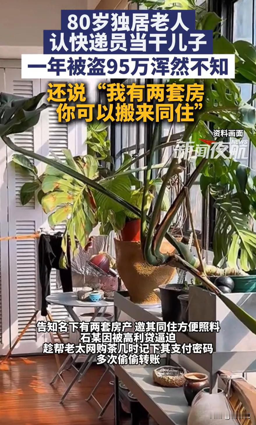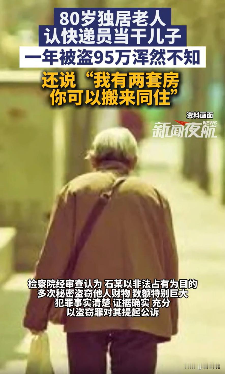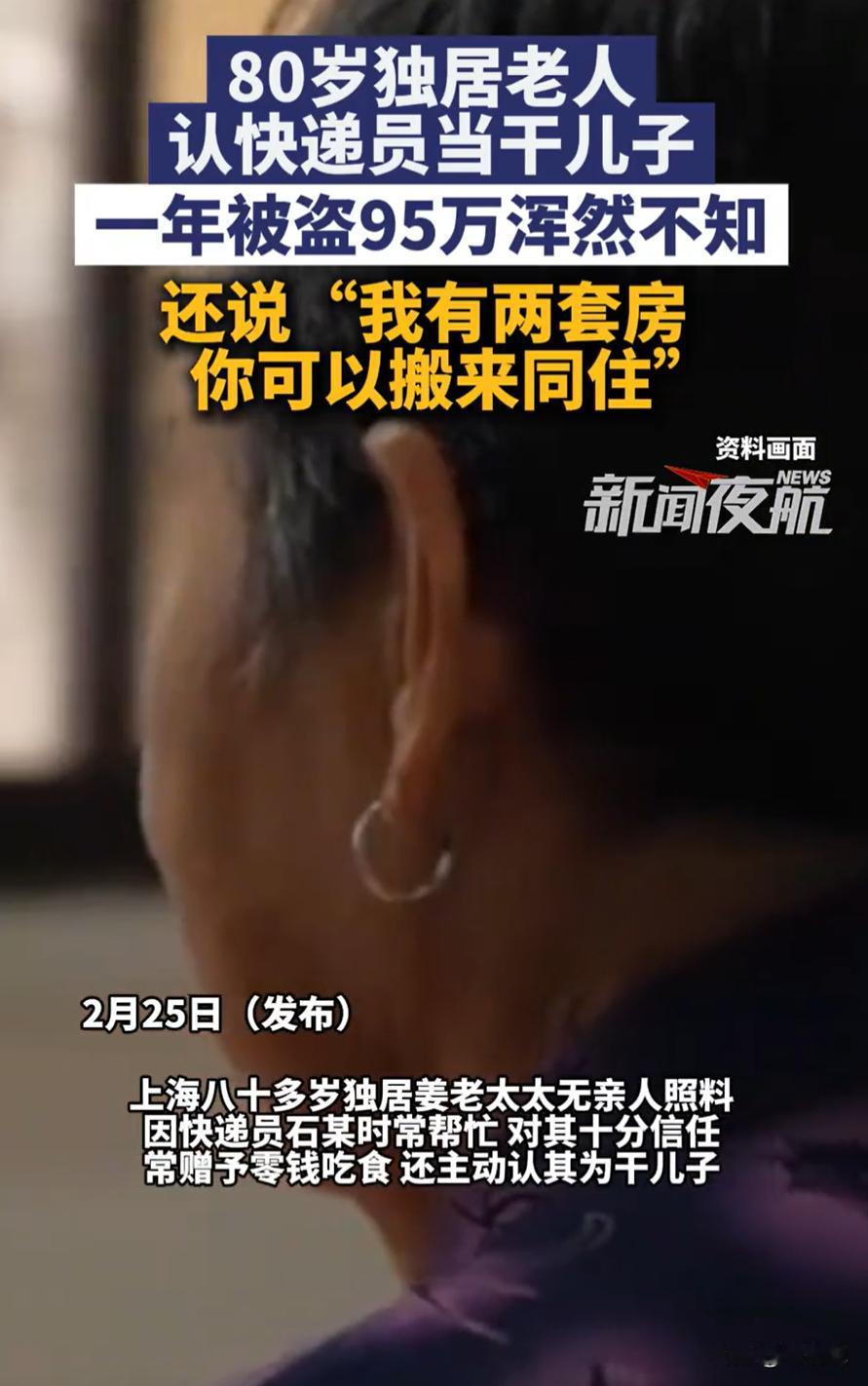 “烂泥扶不上墙!”上海,一位80岁独居老人认快递员当干儿子,对他当自己的孩子一样,不仅平时给零花钱,甚至还告诉对方自己有两套房,邀请他一同来住,可这位干儿子却趁老人不注意,一年内转走其95万元,结果事情还是暴露了 姜老太太一个人住在上海的老房子里,亲戚也少有往来。年纪大了,腿脚不便,生活中很多小事都成了难题 快递员石某隔三差五上门送货,有时候看她拎不动东西就顺手帮一把,有时候看她门口堆着垃圾就捎带手扔掉。这些举手之劳,在姜老太太眼里却格外珍贵 一来二去,老太太动了真心。她觉得这个小伙子实在,靠得住,就主动提出认他当干儿子。老太太没什么值钱的东西,但有两套房产,她说,以后你要是不嫌弃,可以搬过来一起住,互相有个照应 对石某来说,这无疑是天大的好事。一个送快递的年轻人,突然被一位上海本地老人认作干儿子,还许诺了住处和亲情。事情走到这一步,如果踏踏实实过日子,未尝不是一段佳话 可人心隔肚皮 有一次老太太想在网上买茶叶,不会操作手机,就让石某帮忙,顺口把支付密码告诉了他。石某当时正被债务压得喘不过气,看着手机里的余额,动了歪心思 他试着给自己转了一笔钱,几千块。老太太没发现。过了几天,他又转了一笔,还是没动静。胆子就这么一点点大了起来,从几千到几万,转账的次数越来越频繁 后来老太太发现账户里的钱少了很多,起了疑心,去银行查了流水,报了警。警察找到石某的时候,他慌了,赶紧凑钱把一部分转回去。老太太心软,想着干儿子可能只是一时糊涂,也没再追究 如果石某就此收手,这件事或许就翻篇了。可他没忍住。债务还没还清,网上那些女主播还在等他打赏,老太太的银行卡就像一口没上锁的保险柜。他又开始了新一轮的转账 一年多的时间,他前前后后转走了95万 直到老太太再次发现账户几乎被掏空,事情算是彻底藏不住了。检察院以盗窃罪对石某提起公诉,涉案金额特别巨大,等待他的将是法律的严惩 有网友说:这种人老天爷赏饭吃都接不住,这回蹲完出来跑外卖都没人敢要了 这话说的确实有道理,什么叫老天爷赏饭吃?就是一个八十多岁的独居老人,没儿没女,主动认你当干儿子,告诉你她有两套房,还邀请你过来一起住 这意味着什么,稍微有点脑子的都清楚。只要你真心实意对这个老人好,大概率不会亏待你。哪怕最后没给你房子,光是这些年省下的房租、平时老人给的零花钱、逢年过节的表示,也比你送快递挣得多 可石某怎么做的?老人把密码告诉他,是对他的信任,他转头就把这信任变现了 这就是典型的给机会不中用,给台阶不下 独居老人认快递员当干儿子被盗95万