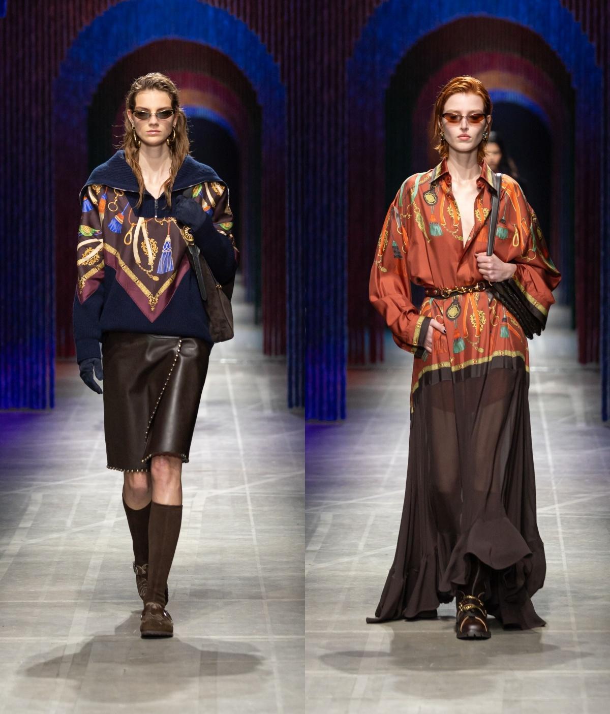 本季在视觉上极尽奢华与对比。设计师将标志性的佩斯里花纹与中世纪动物寓言集的奇幻图案相结合,甚至放大演绎了家族徽章。格纹与错视效果的印花围巾交相辉映,营造出丰富的层次感。剪裁利落的西装点缀着出人意料的羽毛饰边与海狼毛皮,棉毛面料上呈现镂空提花。针织衫上的绳结装饰宛如传令讯号,金色流苏勾勒出系于髋部的丝巾腰带,长款亮片逐渐幻化为轻盈羽毛,展现了流动的美感。调色盘融合了有机中性色、黄色与蓝色,以坚实纯粹的黑色作为压轴基调,平衡了整体的视觉冲击。