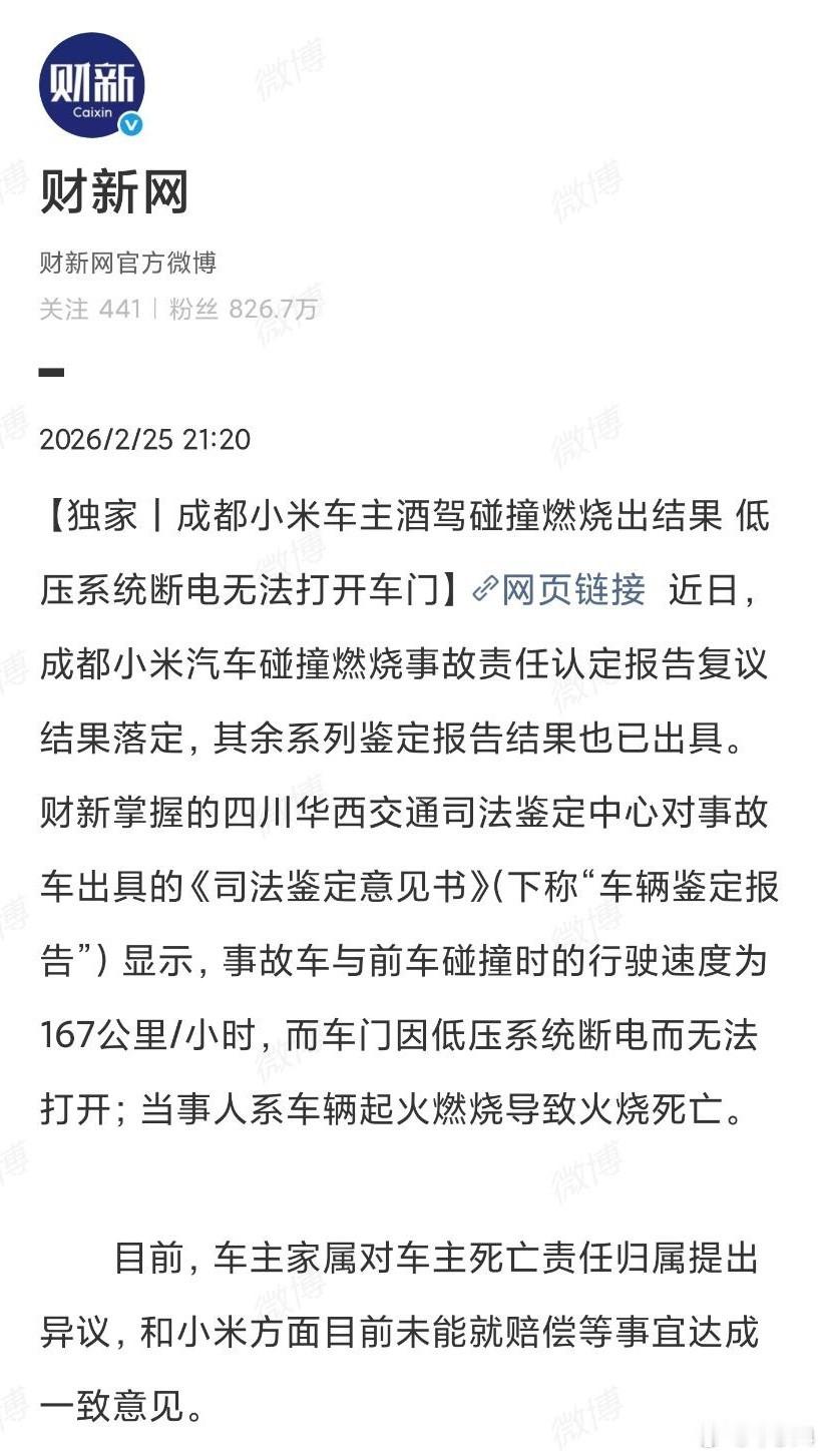 成都天府大道的SU7 Ultra重大事故,调查结果出来了,几个重点:1、与前车碰撞时的行驶速度为167kph;2、车门因低压系统断电而无法打开;3、驾驶者因车辆起火燃烧导致火烧死亡。也就是说,这是一起由驾驶者酒后驾驶导致的事故,而且碰撞速度远远高于实验室中的速度,发生什么都是有可能的。瞬间冲击能量高了5倍多,很难保证电气系统保持稳定运行,它毕竟不是专业赛车。所以,一再提醒大家,酒后不开车,驾驶不超速,马路不是赛道,千万别任性!小米SU7成都碰撞燃烧调查公布