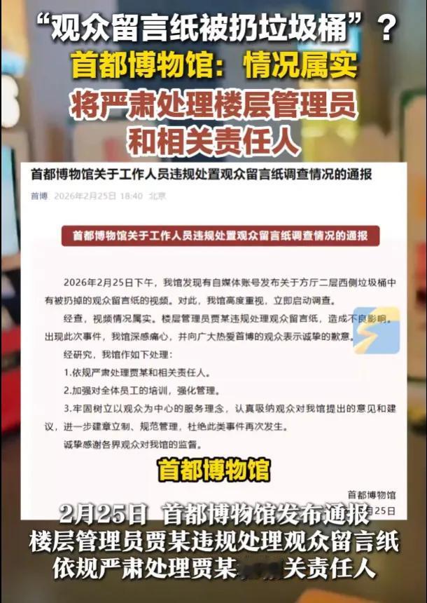 人民群众的意见,就这样被丢进了垃圾筒! 昨天,首都博物馆的垃圾桶火了。不是文物,不是展品,而是一沓当天观众写下的留言纸。这里有孩子们稚嫩的笔迹,游客真诚的感悟,和果皮纸屑躺在一起。馆方火速通报!属实,处理人,加强培训。 但网友依旧不依不饶!怒怼装都不装了?留言本摆在那里,本应是博物馆与观众对话的桥梁,却成了形式主义的秀场。孩子们以为自己的声音会被珍藏,家长以为这是文化传承的仪式感,结果呢?当天写,当天扔,效率属实很高。 这不仅仅是保洁阿姨的疏忽,当执行层认为观众的留言等同于垃圾时,说明在这个机构的潜意识里,以参观者为中心只是一句空洞的口号。对比军博对留言的珍视,首博这次扔掉的不仅是几张纸,更是国家级博物馆的体面。 数字化归档、精选展示、定期回馈,以现在的科技,哪样做不到?非要等到舆论沸腾才来补救?信任一旦破碎,重建何其难。博物馆收藏的是历史,连接的是人心。丢了人心,再厚重的历史也会变得轻飘。