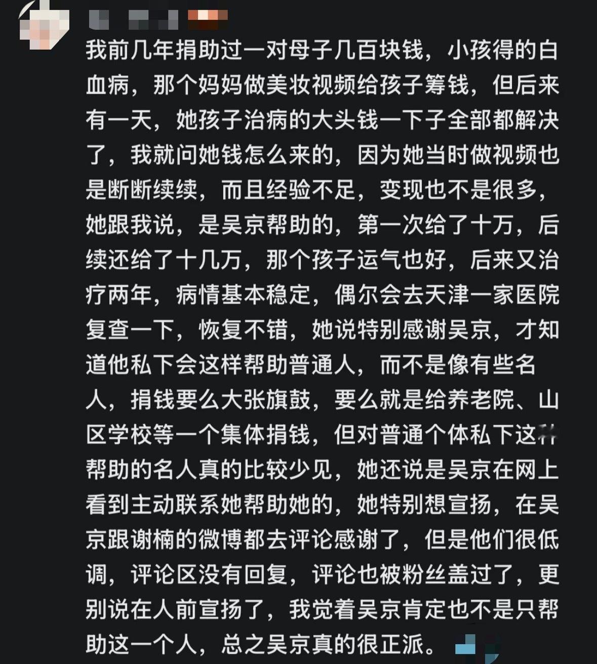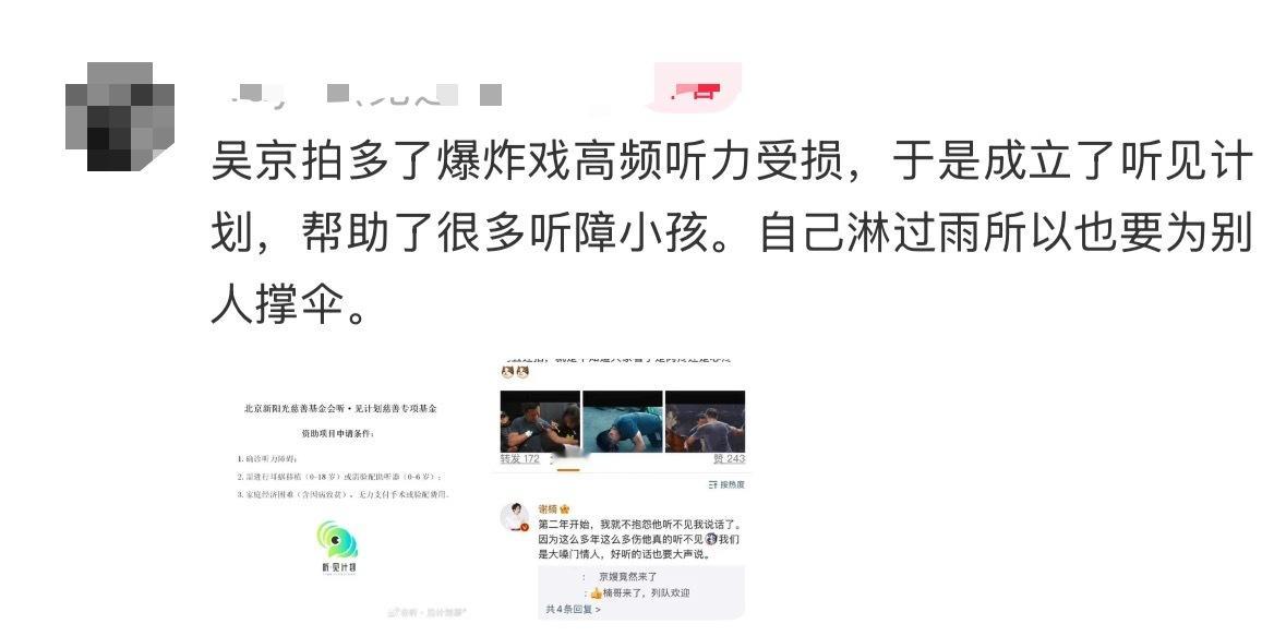 还有些事情很多人不知道,比如吴京在自然灾害时默默捐钱,还有一些不被广泛报道的善意。因常年拍摄动作戏、爆炸戏导致高频听力受损,于是他发起“听见计划”,默默帮扶众多听障儿童,以自身困境共情他人疾苦。另外前几天还看到一个帖子说,他还曾给身患白血病的孩童捐助,这件事他也没说过,也没怎么被报道过,但对那个孩子家庭而言,却是挽救于水火的恩情。这种做好事不留名的事情,何尝不是侠客义举。