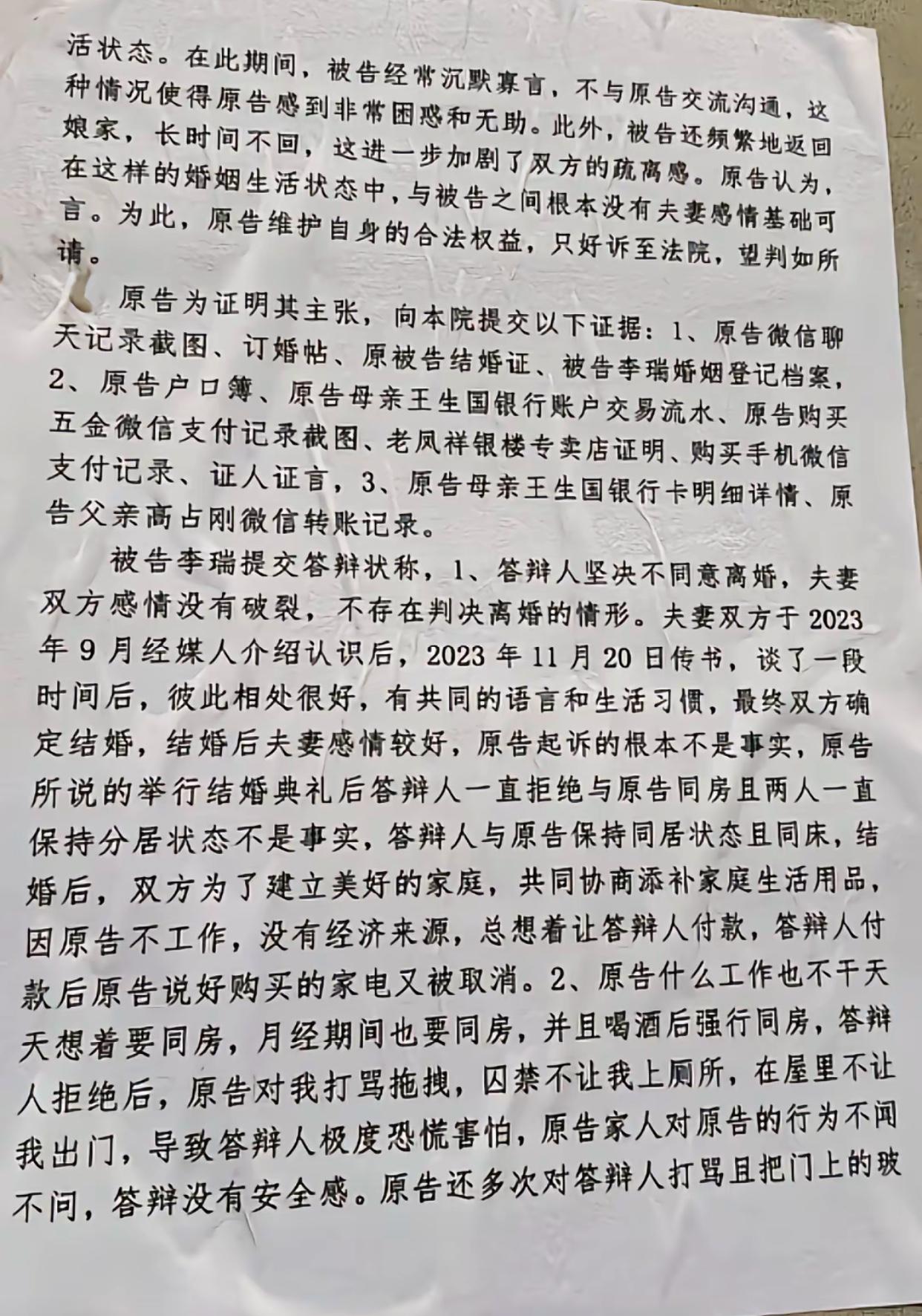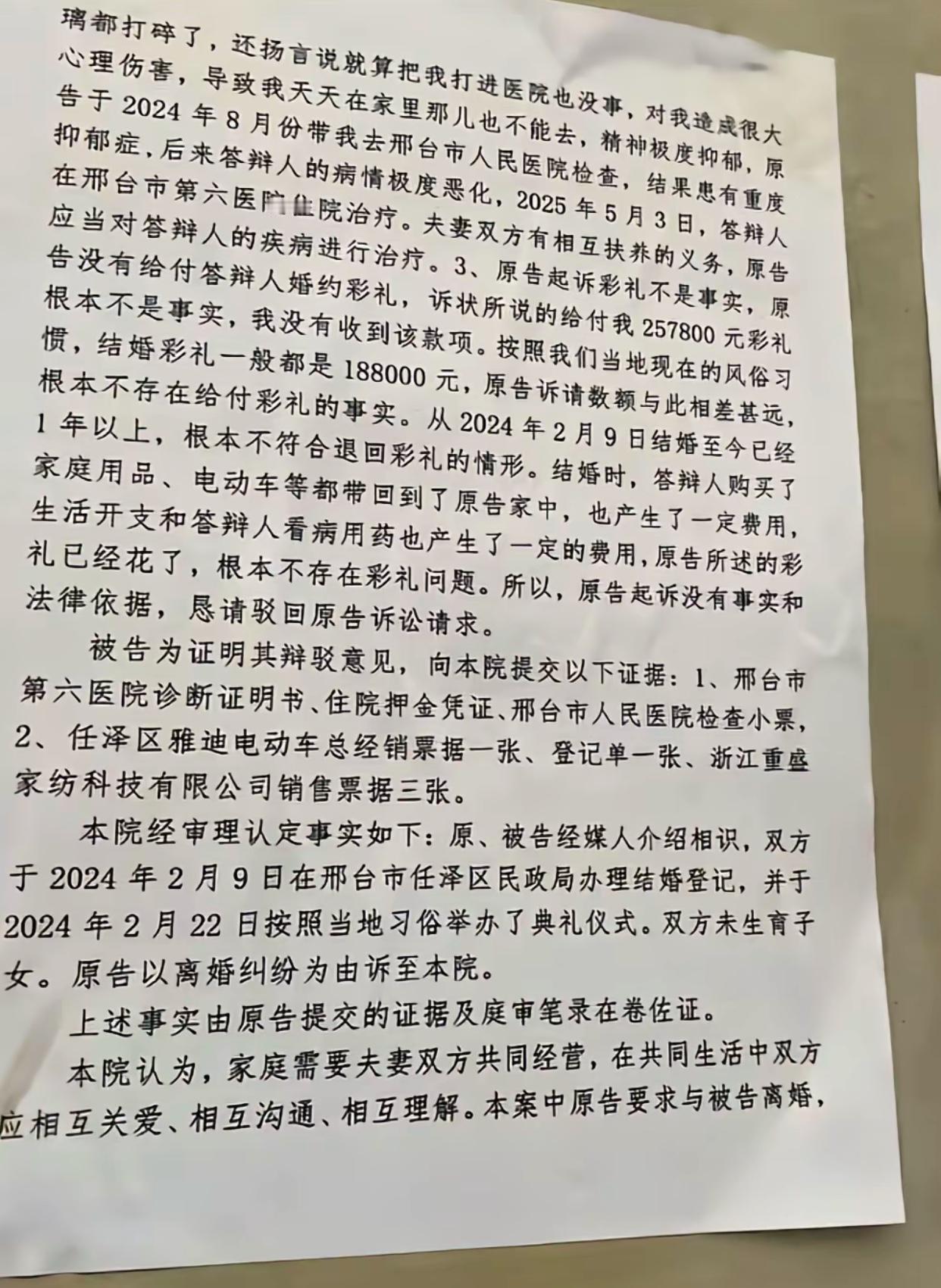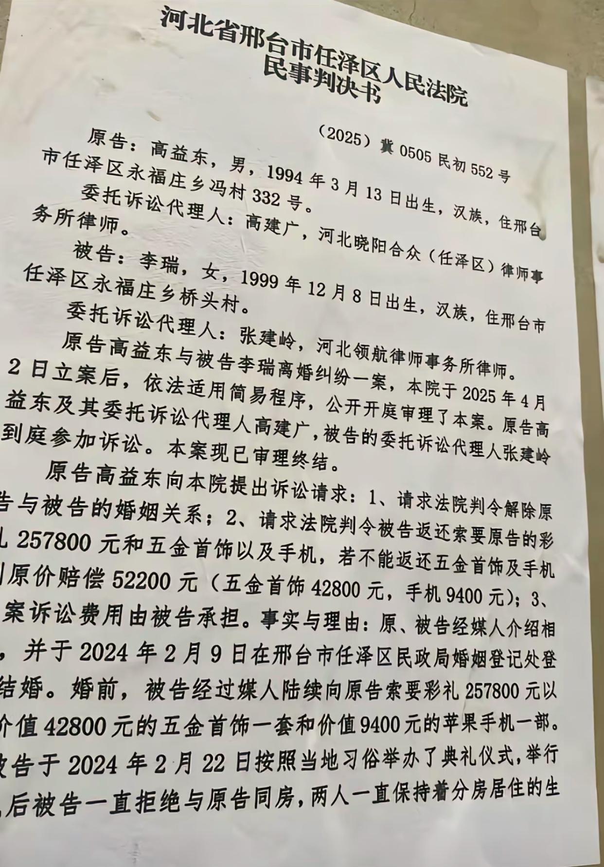 近日,河北邢台任泽区桥头村发生一起婚姻纠纷! 男方是退伍军人,女方二婚无子女,双方通过媒人介绍,之后男方花费约32万娶了二婚李女士,但婚后拒绝不同房,并时常跑回娘家,只偶尔在男方家居住… 双方沟通无果后,男方认为婚姻名存实亡,向女方提出离婚,并要求返还全部彩礼! 但女方拒绝离婚,认为双方感情并未破裂,说自己重度抑郁,情绪不稳定,还反咬男方家暴导致她害怕被打所以不敢回家… 最后因男方提交的证据不足以证明双方夫妻感情破裂,所以法院不予支持男方离婚的诉求…. 现在因多次商量未果后,男方家属上门讨说法,要求退还彩礼,双方发生争吵,引发众多网友吃瓜,现场的视频也迅速在网络上发酵,众多网友们纷纷指责女方骗婚… 如今男方人财两空,失去了婚姻,还背上债务,而女方则觉得婚姻合法,彩礼不应该退,并说自己是真心想过日子的,是对方不珍惜… 但从判决书上女方叙述来看,这感情不是已经破裂了么…[黑线] 尽管网友们普遍认为女方是骗婚,但婚姻登记是合法的,很难定义为诈骗,除非证明女方从一开始就没有结婚意愿,只是为了骗取彩礼,不然只是婚后感情破裂,只能说是民事纠纷… 不过有网友说,女方现在拒绝离婚的行为大概率也是为了拖时间,是想等着彩礼失效期过了… 对此大家怎么看?