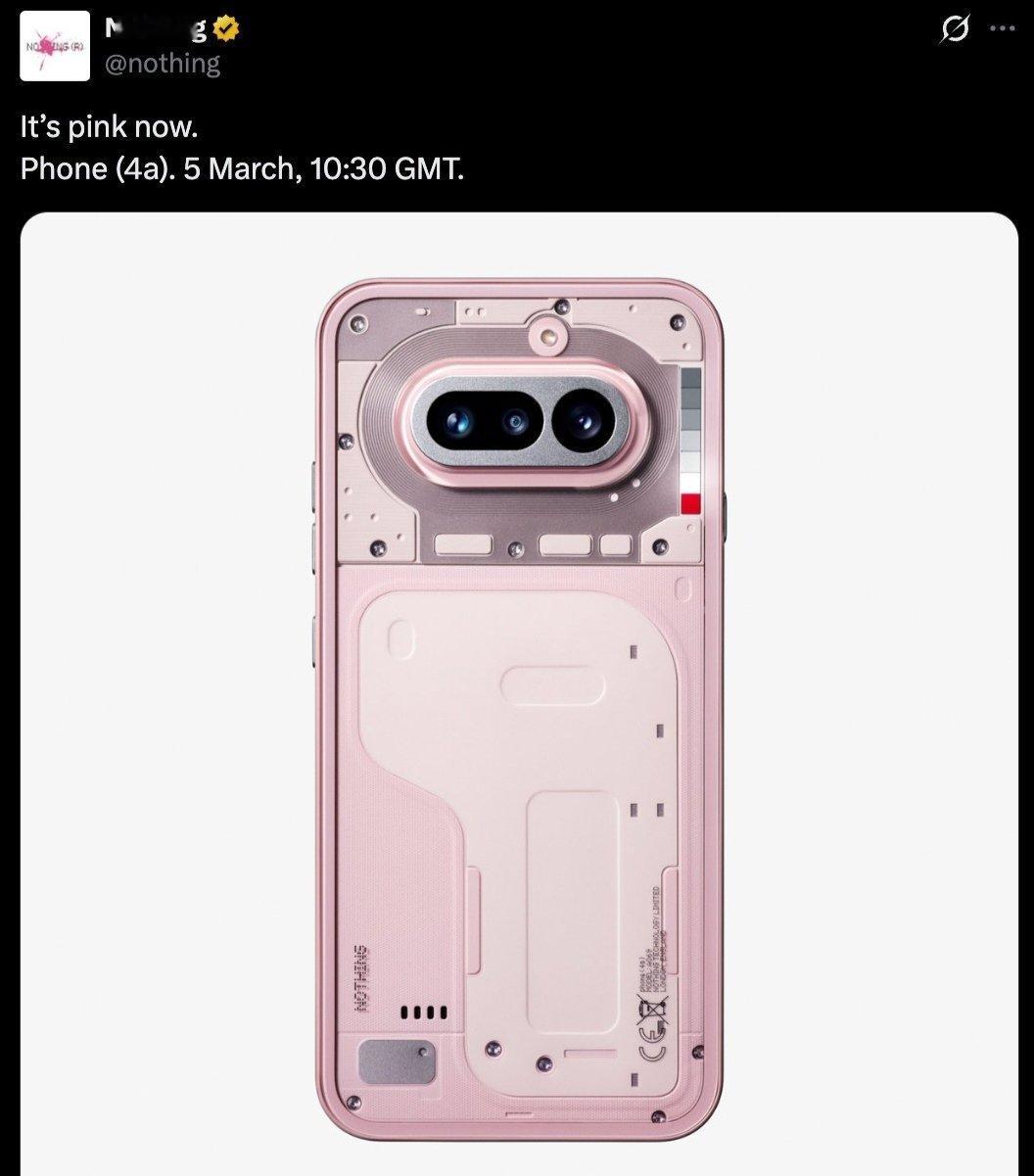 Nothing 官方在 X 平台发文,公布 Phone (4a) 手机粉色版外观,重申该机将于 3 月 5 日正式发布。