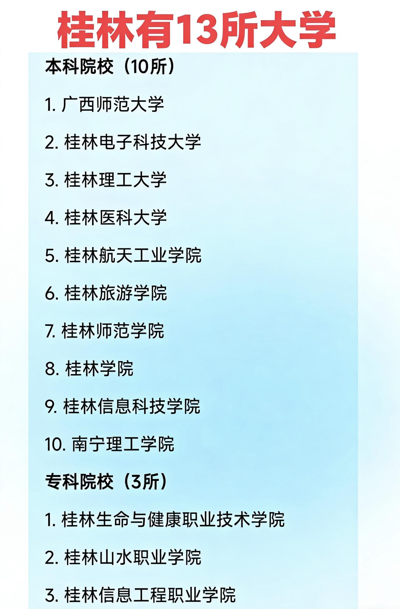 中国三四线小城市高等教育的天花板就是桂林市。桂林2025年GDP才2500多亿,居然拥有13所大学,其中10所本科,不乏广西师大、桂电、桂理工这些名校。桂林山水不但甲天下,高等教育也是独树一帜,风景美如画,确实是读书的好地方。