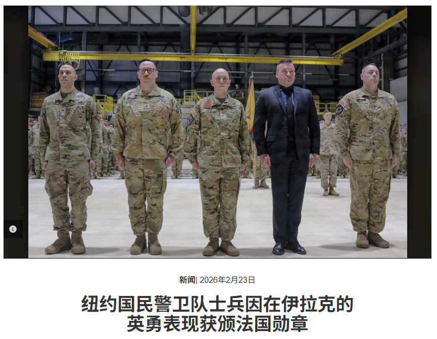 六名美国纽约州国民警卫队士兵由于在2023年8月伊拉克的一场交火中协助营救了34名法国特种部队士兵,在上周日的被授予金质法国国防勋章。2023年8月28日至29日夜间,在伊拉克哈维杰附近,正在执行打击极端组织任务得法国特种部队被敌方火力压制,美军航空兵迅速向被困的法国特种部队提供空中支援,因此荣获嘉奖。烽火问鼎计划