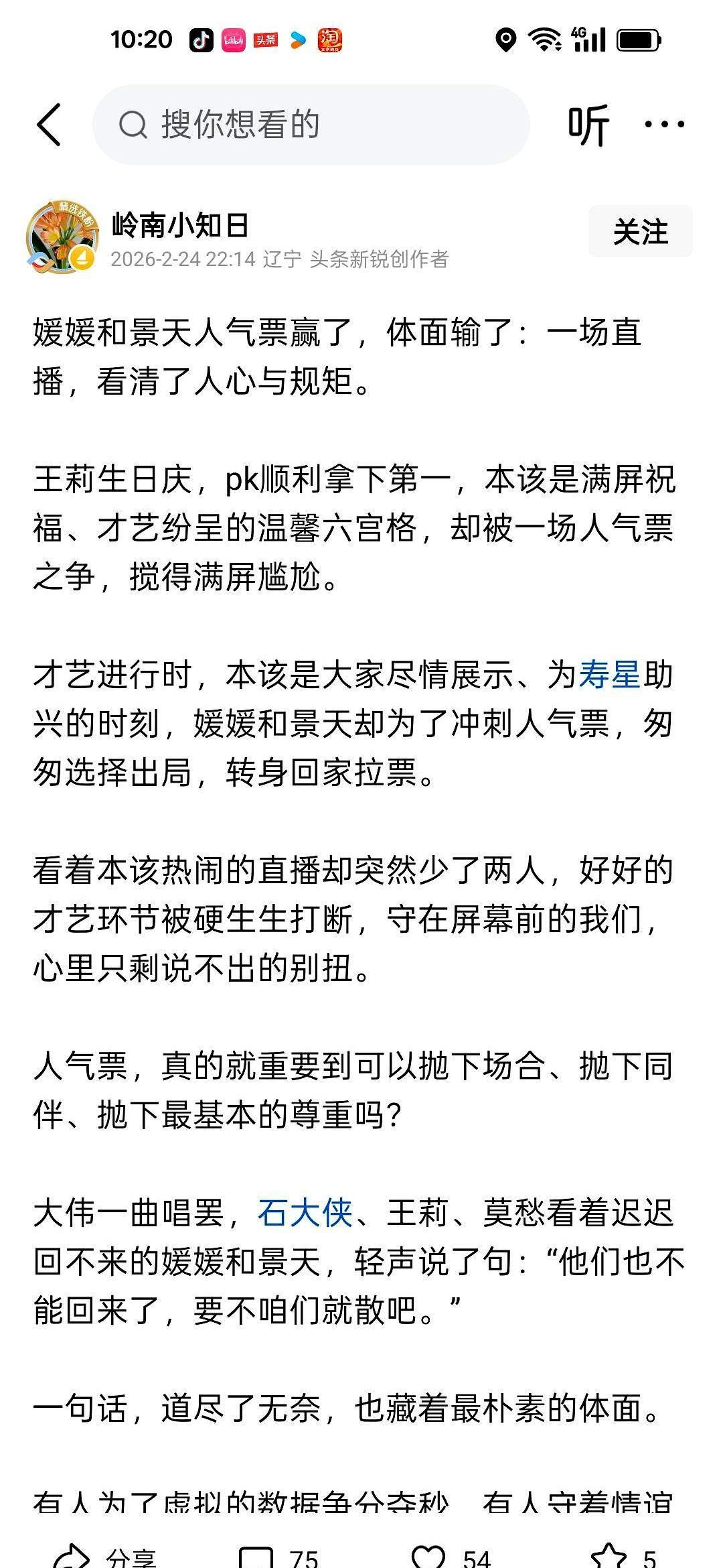 朋友生日会直播到一半,你突然说“我去拉个票”。 直播回放22点14分,她问了,大家同意了。 她跳到别人房间,三分钟,票从3万冲到11万。 但等她回来,直播间已经空了。 弹幕炸了,说她“赢了人气,输了体面”。 为什么别人拉票叫敬业,她拉票就叫抢戏? 因为所有人以为这是纯友谊局,她却突然亮出商业獠牙。 预期碎了,刺痛感就来了。 直播江湖,票是硬的,脸是薄的;情是真的,戏也是真的。 当镜头成为放大镜,每一秒都是公关。