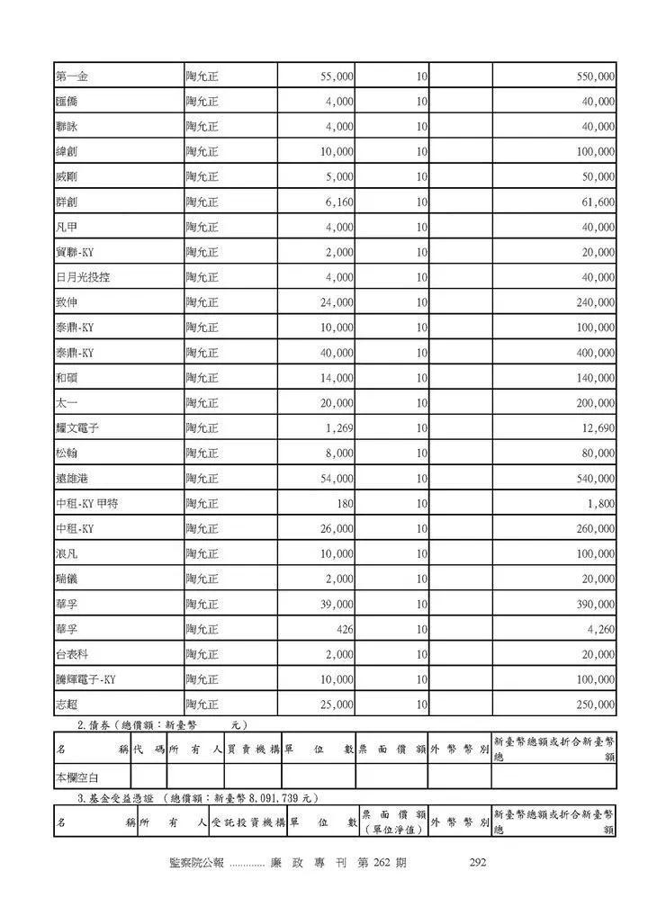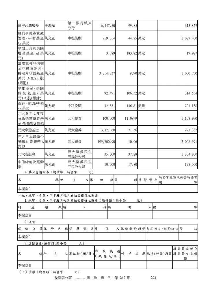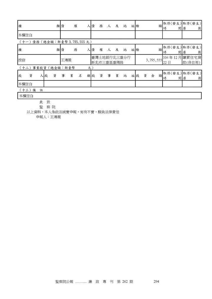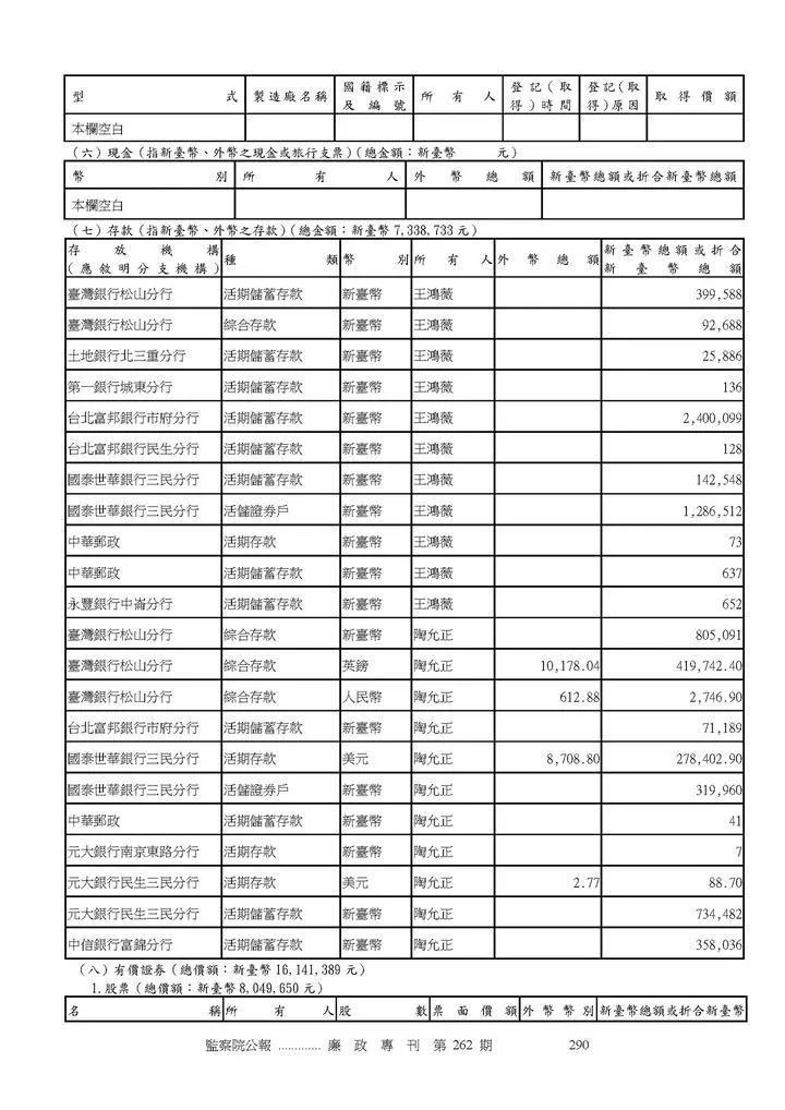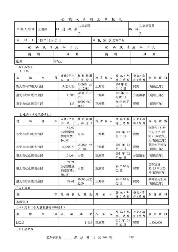 蓝委王鸿薇财产申报曝光 身价显赫 持有台积电、台光电 仅股票就价值近亿! 根据台监察部门最新公布的公职人员财产申报资料,中国国民党籍“立委”王鸿薇的资产概况浮出水面。这份申报表显示,王鸿薇及其配偶陶允正名下拥有多笔不动产、股票及高额存款,整体财务状况稳健。 在不动产方面,王鸿薇名下持有三笔土地及多栋建物,主要位于新北市林口区与台北市松山区。其中,位于新北市林口区的两笔土地面积分别为3,234.80平方公尺与8,650.73平方公尺,持有时间已久,部分为继承取得。此外,她还拥有位于台北市松山区的多处房产,包括一处面积达104.04平方公尺的建物,登记时间为2017年。 在金融资产方面,王鸿薇的存款总额超过730万新台币,主要存放于台湾银行、土地银行、第一银行等多家金融机构。此外,两人还持有大量股票,包括台积电、联发科、鸿海、台光电等科技大厂,以及统一、南亚、中砂等传统产业股票。 特别是持有台积电4.2张(注:台股一张为1000股),股价约合台币840万元,台光电16张,股价约合台币3840万,股票合计持有市值近亿元。 值得注意的是,王鸿薇还持有部分境外基金,如“摩根士丹利美国成长基金”与“富兰克林坦伯顿全球投资系列”,此外,她名下有一辆2010年购买的LEXUS汽车,价值约157万元新台币。 在债务方面,王鸿薇名下有一笔约379万元新台币的房贷,为2014年购置新北市三重区住宅时所贷,目前仍在偿还中。 也难怪现在湾湾地区的年轻人不喜欢蓝营,蓝营立委各个身价不菲,王鸿薇在里面还只是普通水平,真正的大户是苏清泉(身价超5亿台币)、颜宽恒(仅存款就破5千万)张智伦(仅土地就有93笔)、傅崑萁、李彦秀等。