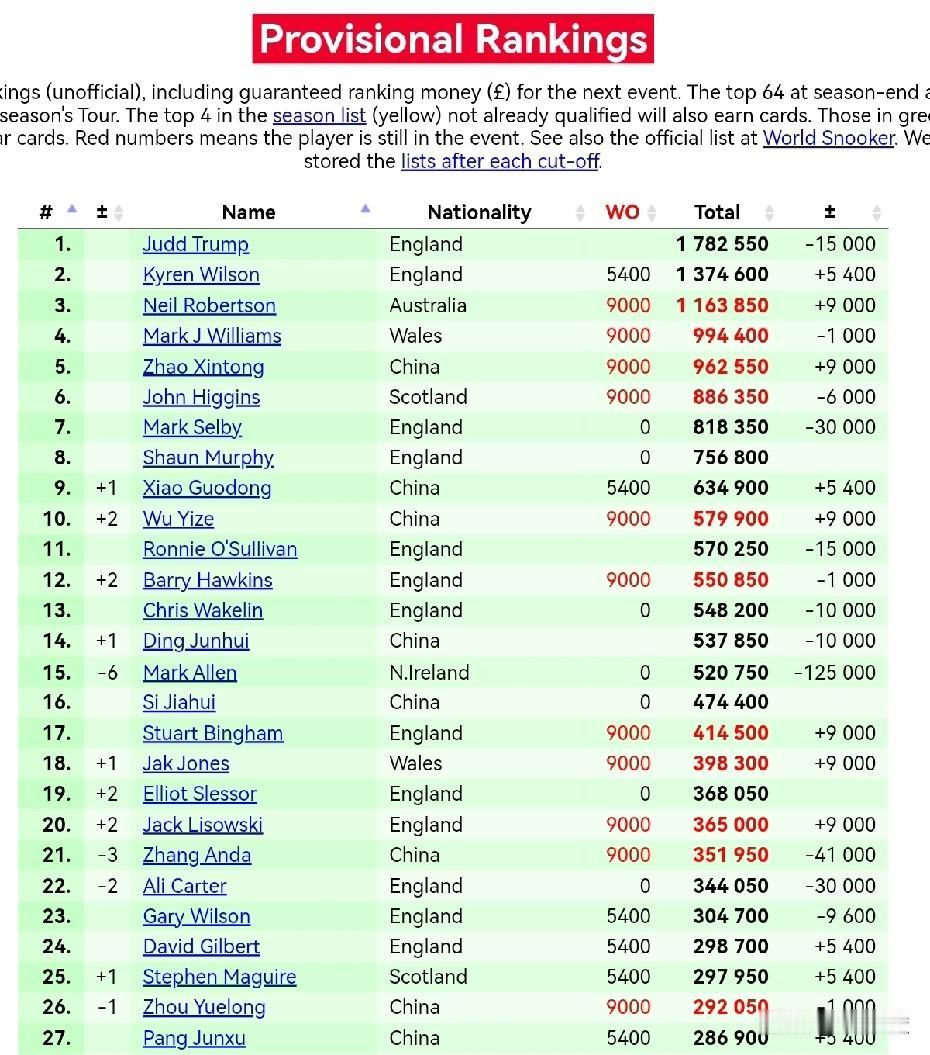马克·艾伦临时排名已经跌到第15位,丁俊晖顺势躺升1位,来到第14位。接下来,世