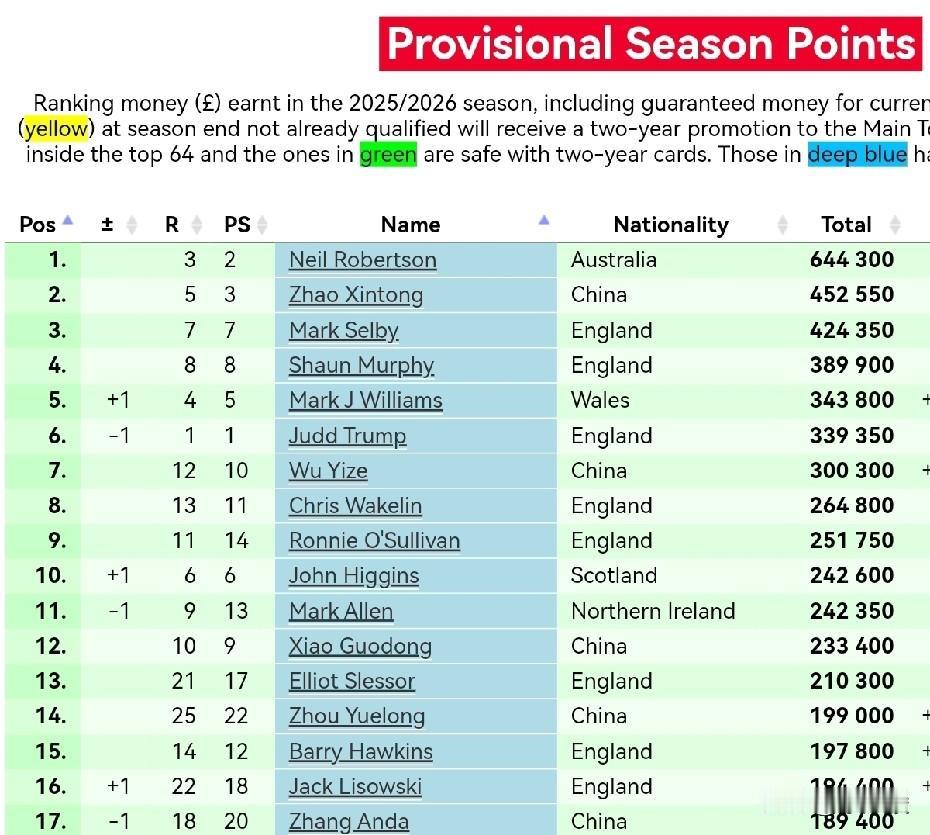 马克·艾伦临时排名已经跌到第15位,丁俊晖顺势躺升1位,来到第14位。接下来,世锦赛种子席位的争夺将变得异常激烈。 马克·艾伦因扣除上上赛季积分,临时排名下降6位,来到第15。 另外,上上赛季艾伦世界公开赛进了第二轮,要扣除5000英镑,巡回锦标赛进了半决赛,要扣除4万英镑,届时这两站积分要逐步被扣除。 今年的世界公开赛艾伦进了正赛,可以增加5000英镑,但能否保住巡回锦标赛资格(单赛季前12,目前艾伦排名第11位),就要看他在世界公开赛上能走多远。 艾伦排名大幅下降后,丁俊晖的排名从第15躺升到第14。不过,丁俊晖的日子也不好过,威尔士公开赛没参加,世界公开赛资格赛出局,巡回赛肯定没有资格了,要命的是,上上赛季丁俊晖还获得了世界公开赛的亚军,届时有7.3万英镑积分要被扣除。 艾伦虽说大概率能拿到英国本土系列赛额外大奖15万英镑,因为本土系列大奖的争夺,只剩小司机和周跃龙有机会了,即使艾伦拿到这项大奖,但由于不算积分,因此对排名没有帮助。 此外,排名第17的宾汉姆和第18的杰克·琼斯紧追不舍,他们也想挤进前16,拿到世锦赛的种子席位。可见,未来世锦赛种子席位的争夺将变得异常激烈。 (注:图三为临时排名,图四为单赛季排名)