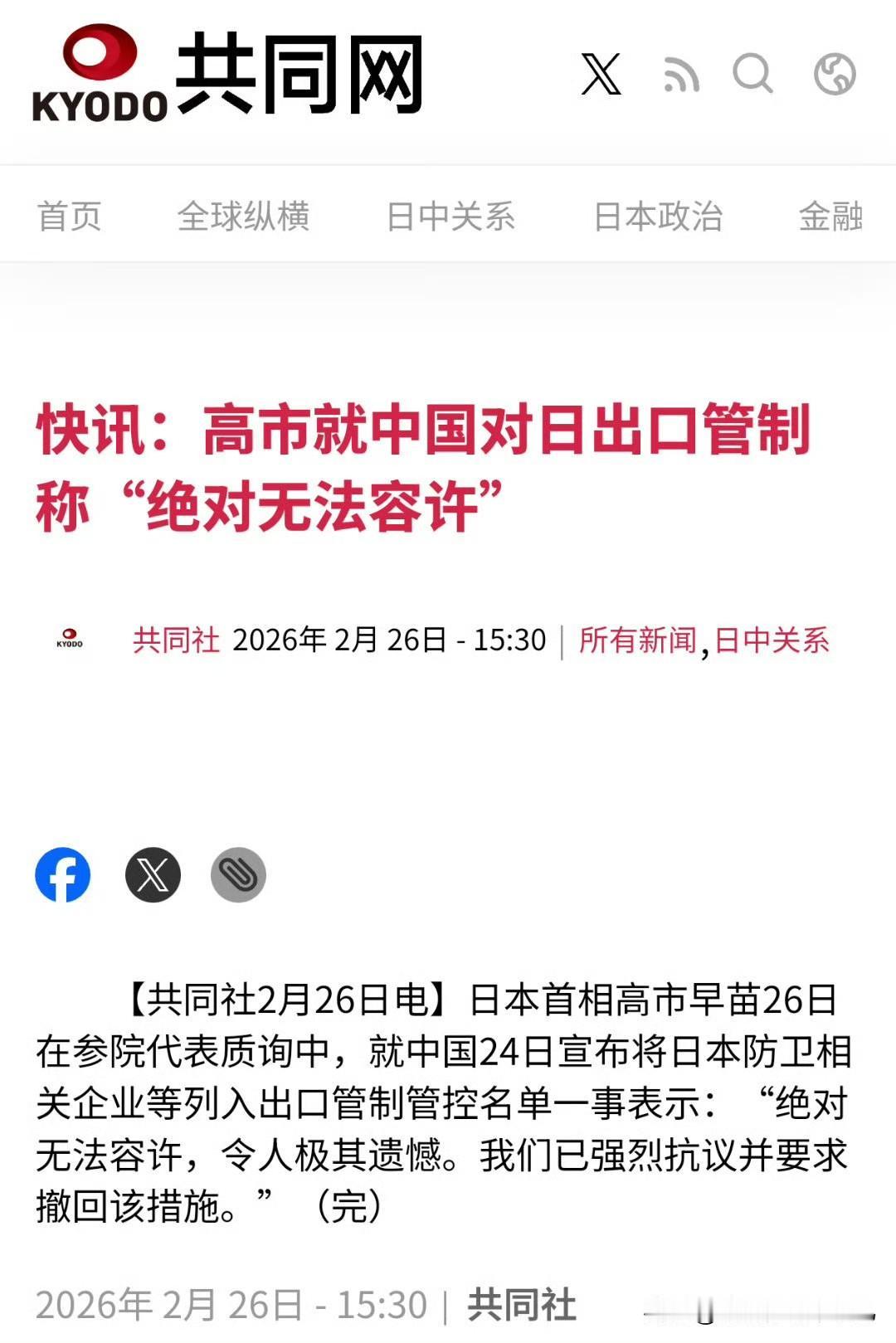 共同社2月26日电:日本首相高市早苗26日在参院代表质询中,就中国24日宣布将日本防卫相关企业等列入出口管制管控名单一事表示:“绝对无法容许,令人极其遗憾。我们已强烈抗议并要求撤回该措施。” 首先出口管制的核心属性是中国的出口管制措施,本质是基于国家安全和利益的合规监管手段,通常针对涉及军事、敏感技术等与防卫相关的领域,符合国际通行的贸易规则与国家安全原则。 对于日方所谓“绝对无法容许”的抗议,还不是在担忧相关防卫企业的供应链、技术合作或物资采购受到限制,影响其防卫产业运作及相关布局。 此次分歧是中日在经贸与安全领域的一次博弈,中方的出口管制并非针对特定国家,而是基于自身国家安全与发展利益的必要举措,任何国家在涉及核心利益时,都会采取类似的合规监管措施,这一点在国际上早有先例。