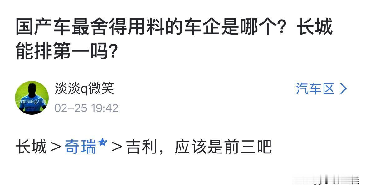 网友:“国内最舍得用料的车企是哪个?” 来自某网友的国内车企车身用料前三排名,看到这个就真哈哈了!第一个、第二个咱不知道,先不说了,但第三个自己心里没点数嘛?比别人大一圈的车,售价比别人还低一截,除了摸石头过河能节省点成本外,还有一部分成本,大家想想应该会在哪里体现出来?亏本是不可能亏本的,最多就是少赚![呲牙]