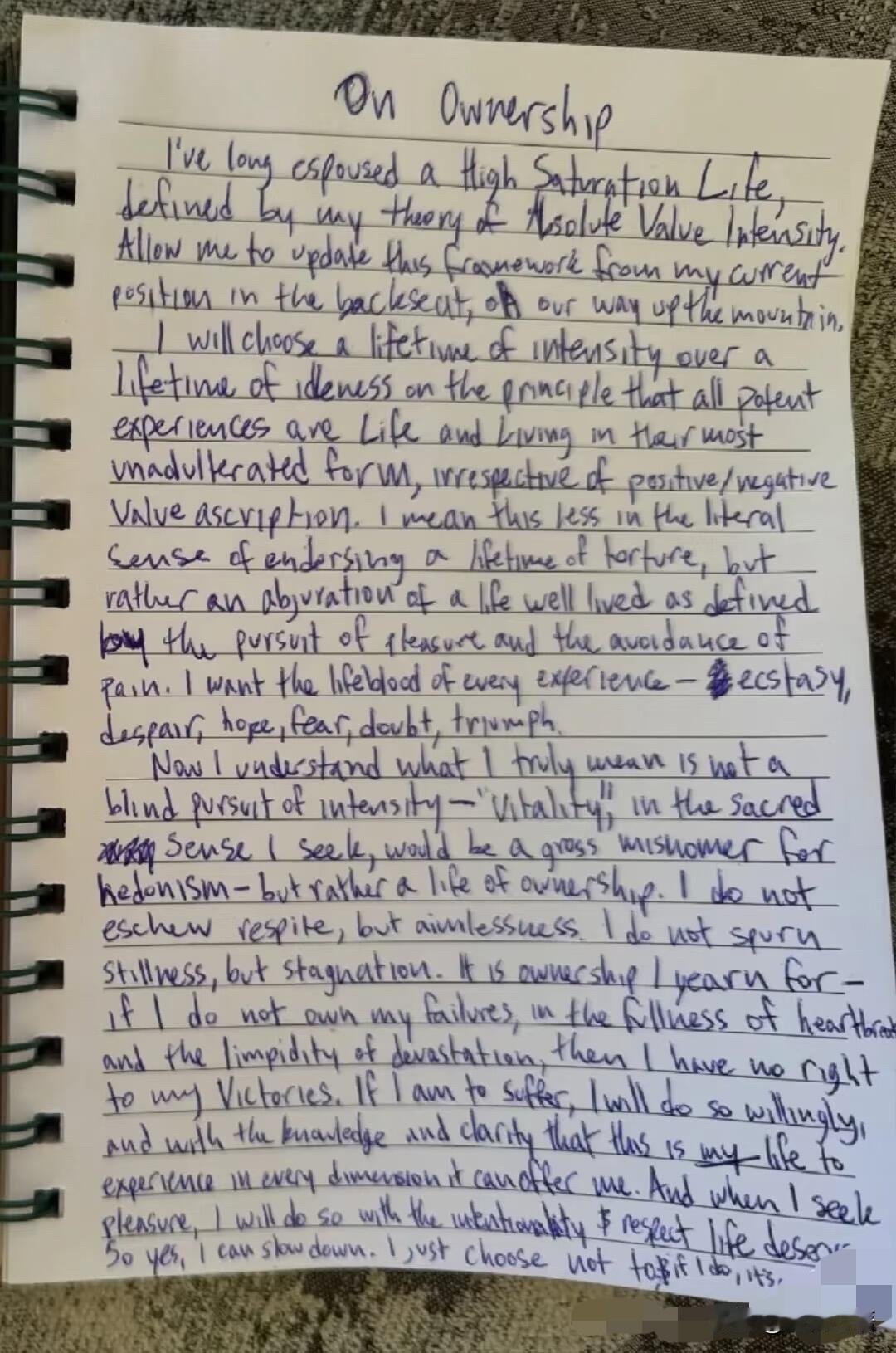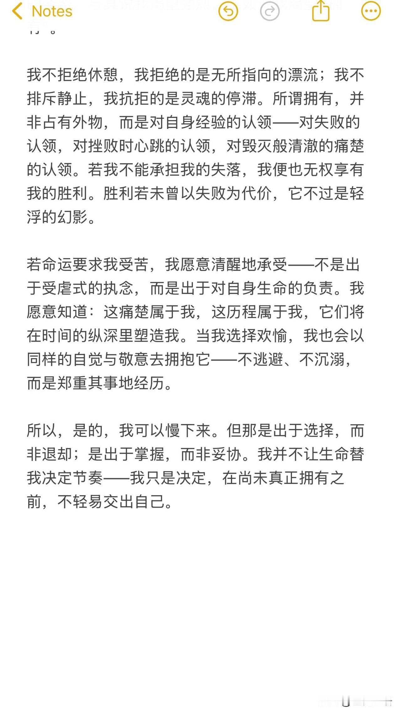 读谷爱凌的内驱力日记 真的被震惊到了 字里行间全是通透的人生哲思 她不要一生的平顺 偏选满腔的激荡 说所有经历都是生命本身 无关好坏 只是最真实的模样 谷爱凌4岁开始就写日记 还专门用手写 因为她认为不用手写 别人绝不会相信是她4岁写的 不知道她写了啥[笑哭] 不盲目追强烈的感受 真正想要的是拥有自我 认领每一次失败与痛楚 也接住属于自己的胜利 不拒绝休憩 却厌弃漂流 不排斥静止 更抗拒停滞 苦乐都清醒承受 欢愉也郑重拥抱 原来真正的内驱力 从不是趋乐避苦 而是敢直面所有经历 认真活好每一刻