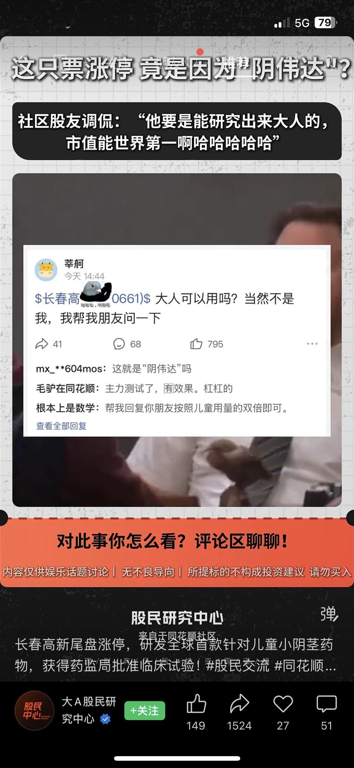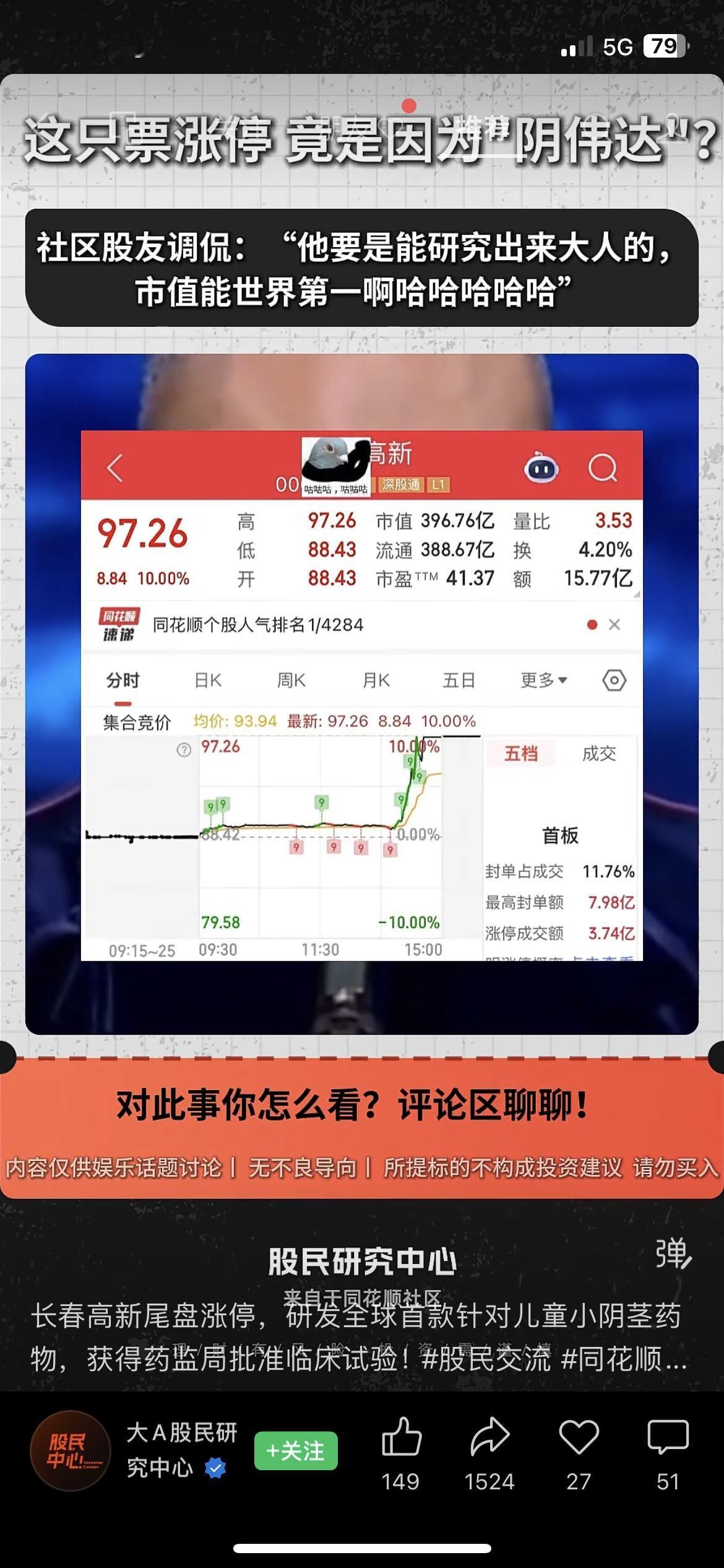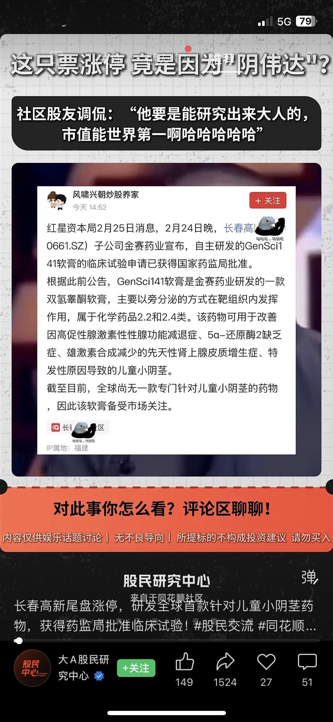 今天长春高新尾盘直接涨停,市值冲到396.76亿。原因是子公司研发的一款儿童小阴茎药物,获得了国家药监局的临床试验批准。股吧里讨论热度很高,我身边的老股民朋友,看完直接说“这就是情绪炒作,别碰”。说白了,药物还在临床阶段,距离上市、盈利还有很长的路,此刻的涨停,更多是情绪推动的短期热点。市场有风险,投资需谨慎,不构成任何投资建议。你会追这种“概念股”吗? 长春高新 股市风险 医药股A股创新药