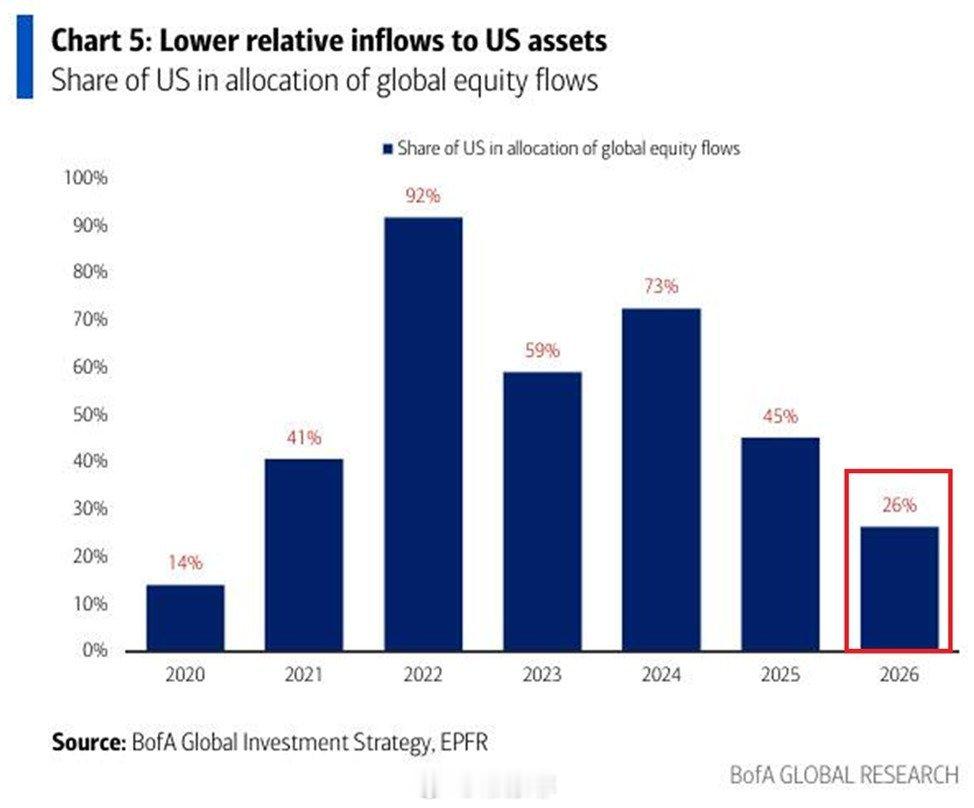 到 2026年, 每流入全球股票基金的100美元中,只有 26 美元会流向美国股票, 这是自 2020年以来的最低配置比例。
