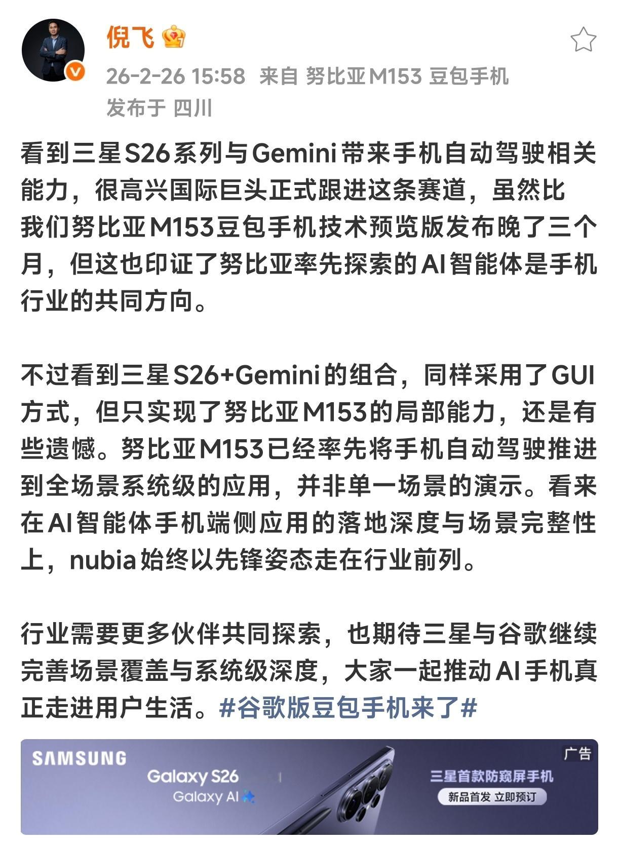 倪飞这话算是把实话说透了,三星S26+Gemini的这套组合看着热闹,实则只是摸到了手机AI智能体的门槛。努比亚早三个月就把全场景系统级应用落地,跨应用操作、系统级调度这些真功夫,可不是单一场景演示能比的。高管称S26只实现豆包手机局部能力 国际大厂跟进是认可,但赛道领跑者的硬实力,从来不是靠跟风就能追上的。努比亚总裁倪飞回应谷歌版豆包手机 可能话说的不是那么的好听,但确实作为领跑者有这个资格,我现在就期待新一代豆包手机,能不能再给突破突破?