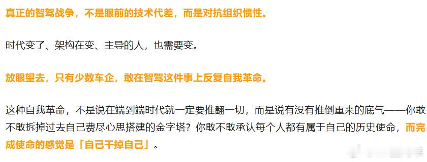 来自于的撰文,这段话说的可真好。身处于软件产业,深刻感受到这点,一个真正的技术浪潮来的时候,难得并不是简单的“跟上”,而是从思想到组织到人员的重构能不能做到。否则就是嘴上喊着技术变革,实际上做一些欺上瞒下的事罢了大v聊车