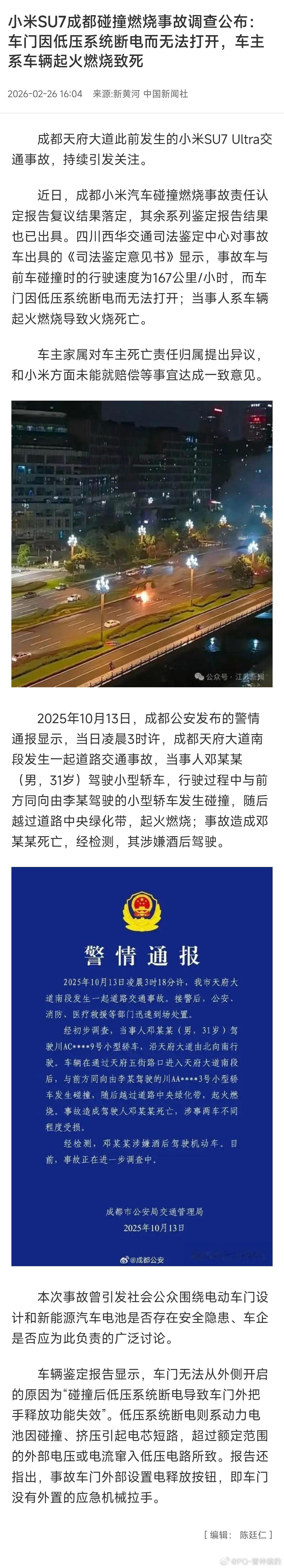 小米su7成都碰撞燃烧调查公布《司法鉴定意见书》显示事故车与前车碰撞时的行驶【速度为167公里/小时】而车门因低压系统断电而无法打开当事人系车辆起火燃烧导致火烧死亡还有重要信息不要忘记【涉嫌酒驾】