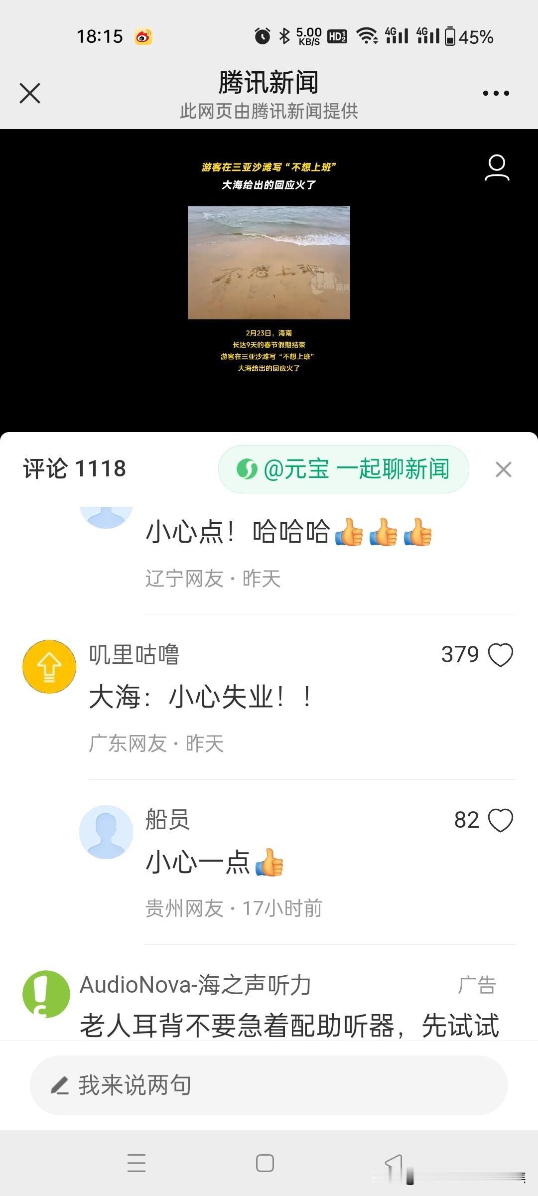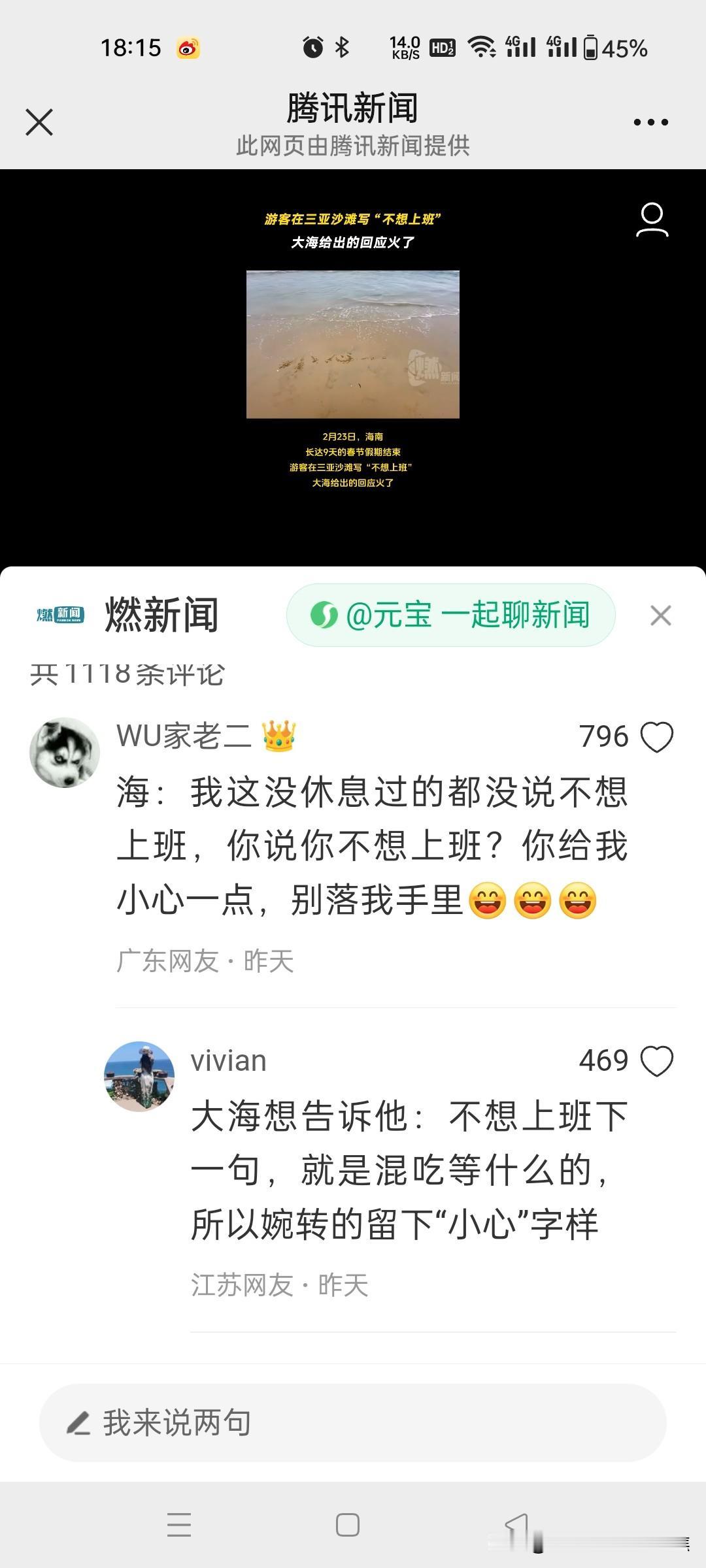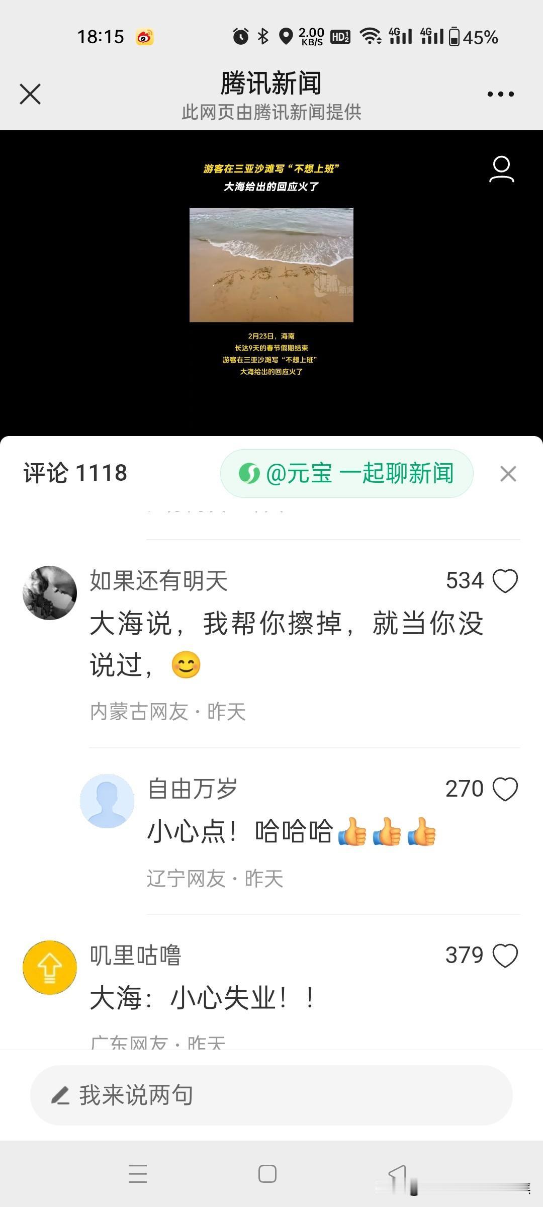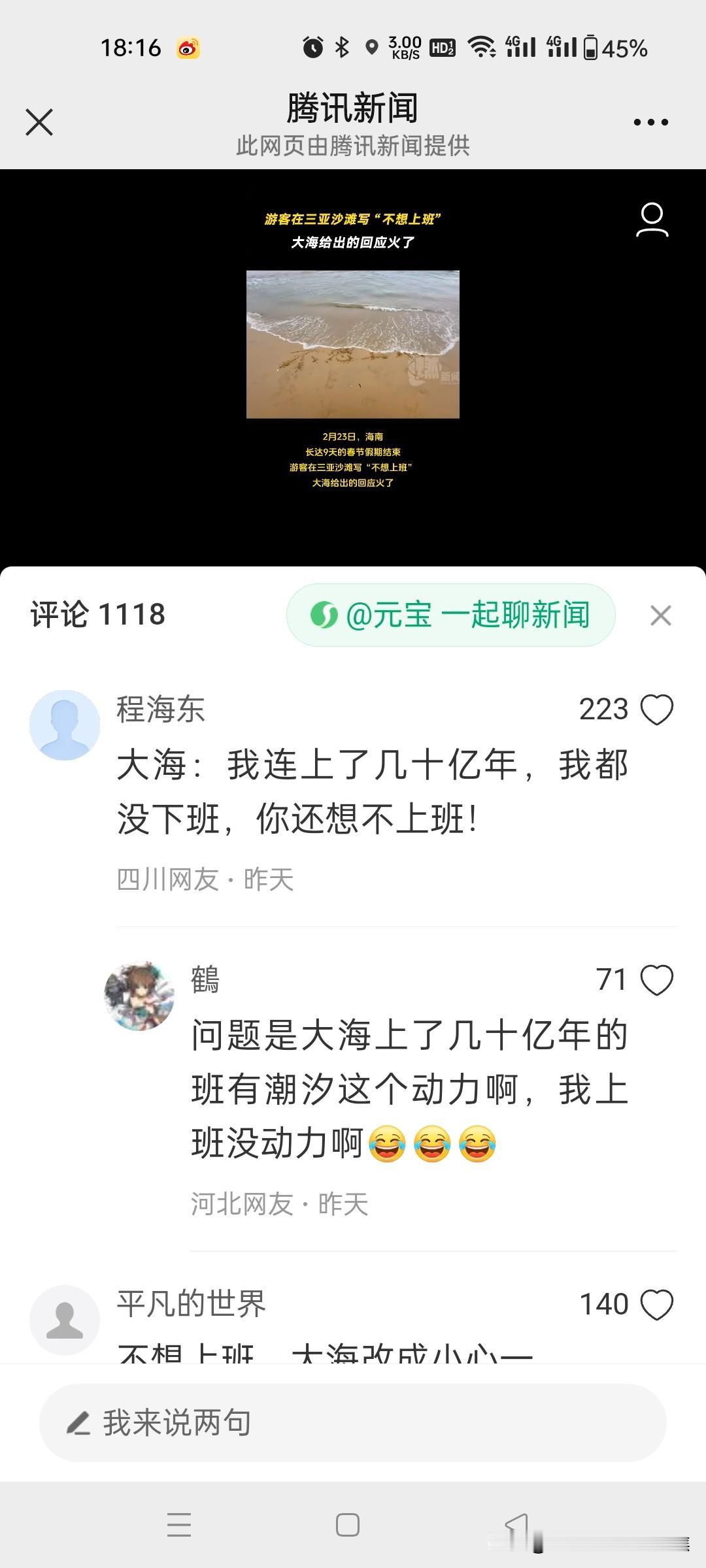 游客在三亚沙滩写“不想上班”,大海给出的回应火了!网友的回复太通透了。 在三亚沙滩上,有游客写下“不想上班”,结果一个浪打来,字变成了“小心一点”,这大海的回应瞬间火了。网友们的回复那叫一个通透,有人说大海是在提醒,不上班生活可能有风险,得小心着点;也有人调侃这是大海在劝游客别做梦了。其实想想,谁不想逃离上班的压力去享受悠闲,但现实往往不允许。这沙滩上的文字转变就像生活的小玩笑,提醒我们在向往自由的同时,也要面对生活的责任。不过偶尔去海边写写字,让大海回应一下,也算是一种别样的解压。