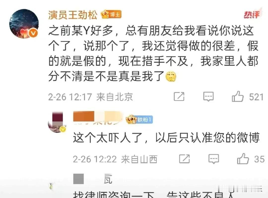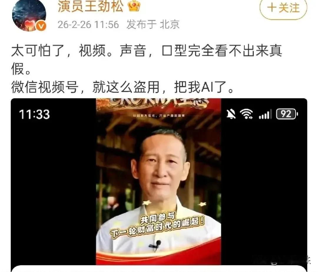 王劲松被“自己”吓得报警?这AI假脸连他妈都认不出! 看到王劲松老师最近的经历,真是又好笑又后背发凉。 这位公认的老戏骨,国家一级演员,前两天差点被“自己”给整懵了。他说自己在微信视频号上,刷到了“王劲松”在视频里侃侃而谈。关键是那声音、那口型、那神态,简直比真的还真!结果仔细一瞅,好家伙,是个“AI高仿号” 。 王老师当场就惊了,发文直呼“太可怕了”。更吓人的是啥?他家里人都愣是没分清楚哪个是真儿子,哪个是假货 。你说这事闹的,如果哪天这“假王劲松”在视频里管网友借钱包,或者推销啥三无保健品,这锅到底算谁的? 以前总觉得AI诈骗离我们很远,觉得那些粗糙的合成一眼假。但现在这技术进化得太快,连靠脸吃饭的专业演员都能给“复刻”了 。 说实话,这事搁谁身上都得哆嗦。虽然视频现在投诉删了,但谁能保证明天不会蹦出来一个更真的?这哪是技术便利啊,这分明是在给犯罪分子“发高科技武器” 。 科技再怎么发展,也不能拿真人当“工具人”啊!还是希望那些玩AI的“高手”们把劲儿使对地方,别总盯着老艺术家的脸不放。不然以后咱们看视频,是不是都得先对个暗号才能信?