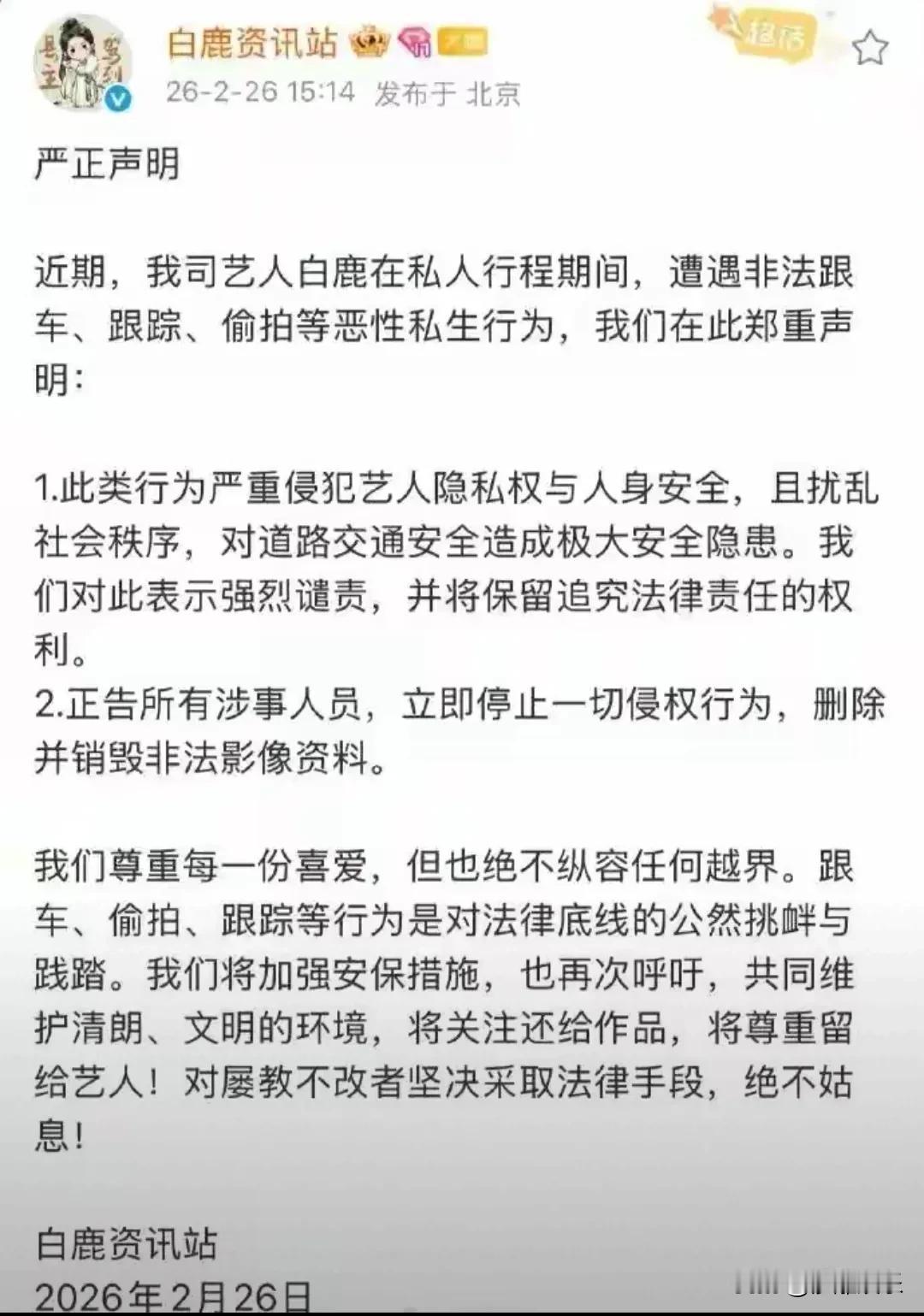 白鹿抓“私生”无果气到甩围巾泄愤:这一甩,甩出了多少打工人的心酸? 累了一天想回家躺着,结果后头还跟着几条“尾巴”。这事搁谁身上不炸毛? 2月26日,白鹿从机场收工回家,又被私生饭跟车了。这回姑娘没忍,直接让司机靠边停车,自己下来抱臂站在路边“抓人”。结果对方跟做贼似的死活不露头,白鹿转了半天连个影儿都没抓着,最后只能憋着一肚子火上车,气得把围巾狠狠一甩!那一下,真是又飒又让人心疼 。 这围巾甩出去的可不只是脾气,那是多少天被偷窥、被尾随攒下的委屈啊。据说不光跟车,还有凌晨打骚扰电话的,甚至有人想往她住的楼层钻 。我就纳闷了,这哪是粉丝啊,这跟“狗皮膏药”有啥区别? 咱喜欢一个人,是奔着作品去的,不是奔着把人逼出神经衰弱去的。白鹿这一甩,甩出了边界感——离她的生活远一点,离她的作品近一点,不行吗?