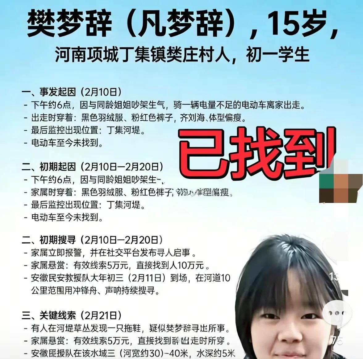 多清秀的女孩啊!可惜了,离家出走的15岁女孩樊梦辞的遗体在一处水域里被找到了! 樊梦辞是河南项城人,在家里排行老二,上面有一个姐姐,下面有一个弟弟,她在家里的地位比较尴尬。 她之所以离家出走是因为与姐姐发生了争执,姐姐比较强势,而樊梦辞比较敏感。姐姐在妹妹离家出走后就后悔了,爸爸妈妈也是第一时间报警寻找她。并且发了寻人启事愿意给提供线索的人出5万元的费用。 她不知道爸爸妈妈有多爱她,要是知道了就不会去做傻事了。 有人的地方就会有争执,可以生气但不要做傻事,生命只有一次,死不能解决问题。 这件事也告诉为人父母的我们,一定要注意孩子的情绪变化,不能认为给孩子吃饱喝足了就行,要多与孩子沟通。
