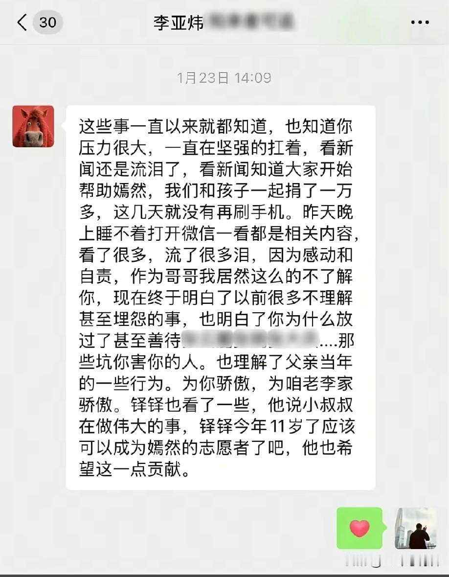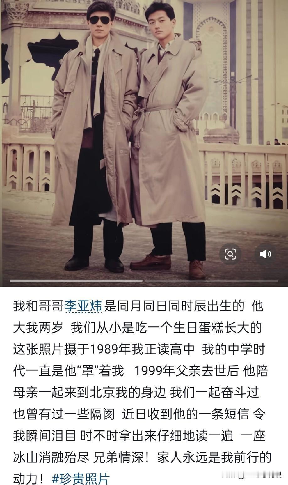 2月26日,李亚鹏罕见谈及亲哥,他晒出一张与哥哥李亚炜年轻时的合照,两人都是又高又帅气,兄弟俩是同月同日同时辰出生的,这缘分真是太奇妙,世界上大概找不出几个这样的了。 李亚鹏还晒出与哥哥的聊天记录,可见兄弟俩在嫣然医院的事曝出来之前是有隔阂的,而且还不小。 不过,通过这件事哥哥完全理解他了,也很心疼他。这就是亲兄弟吧,没有什么解不开的隔阂,毕竟是一个娘肚子里爬出来的,比谁都亲。 另外,不得不说李亚鹏确实是太善良,哥哥信息里有提到的之前坑他的人名,他都打了马赛克,这种格局不是人人都能做到的!