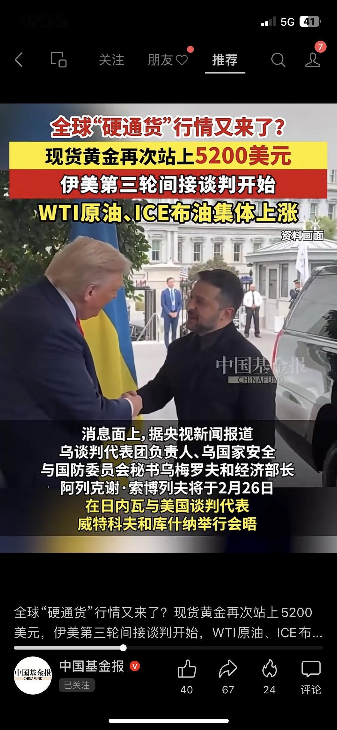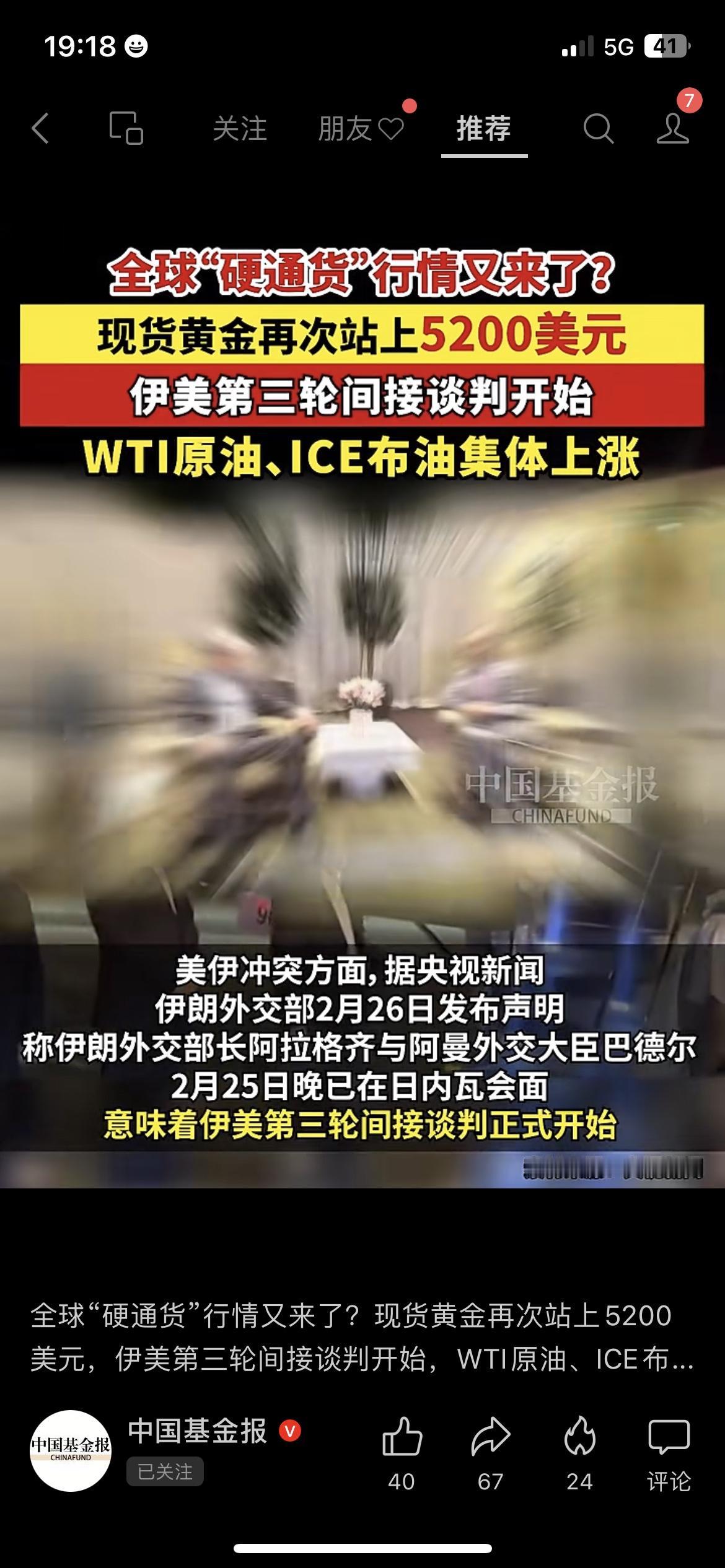 伊美谈判刚重启,黄金直接冲上5200美元,原油也跟着拉升,市场根本没信“缓和”这两个字。 我身边不少朋友早上还在问,是不是局势好转了? 其实很简单:谈判是谈判,资金是资金。 伊朗是重要产油国,地缘一紧张,油价就有支撑; 黄金是全球硬通货,只要不确定性还在,就会有人往里避险。 咱普通人别被消息带着跑,也别一涨就追、一跌就慌。 手里有相关基金的,拿稳别乱动; 没上车的,别盲目跟风冲进去。 市场有风险,投资需谨慎,不构成任何投资建议。 黄金 原油 理财 财经